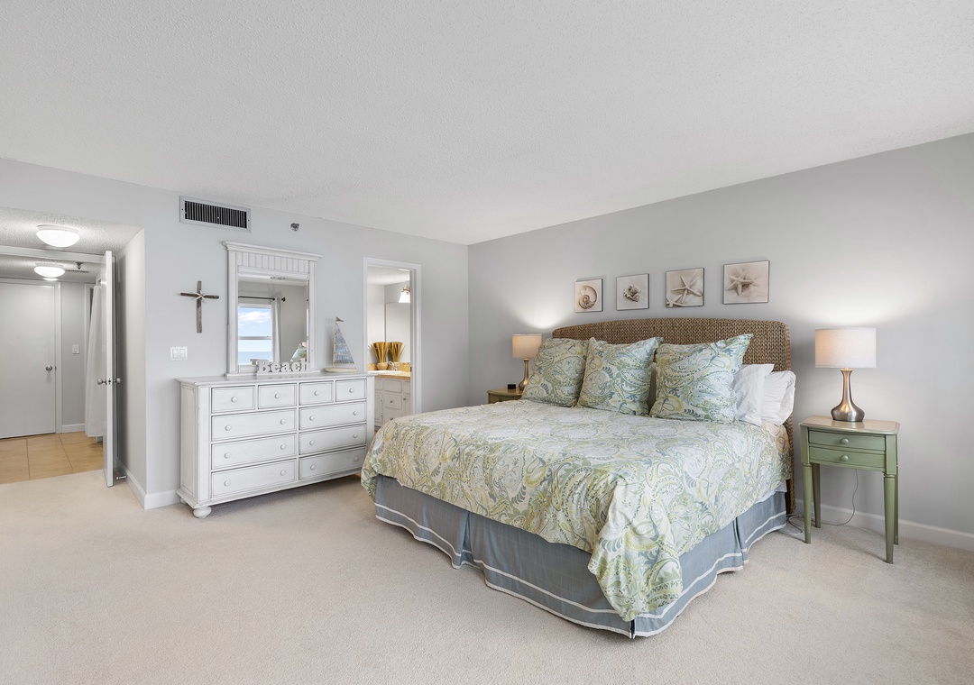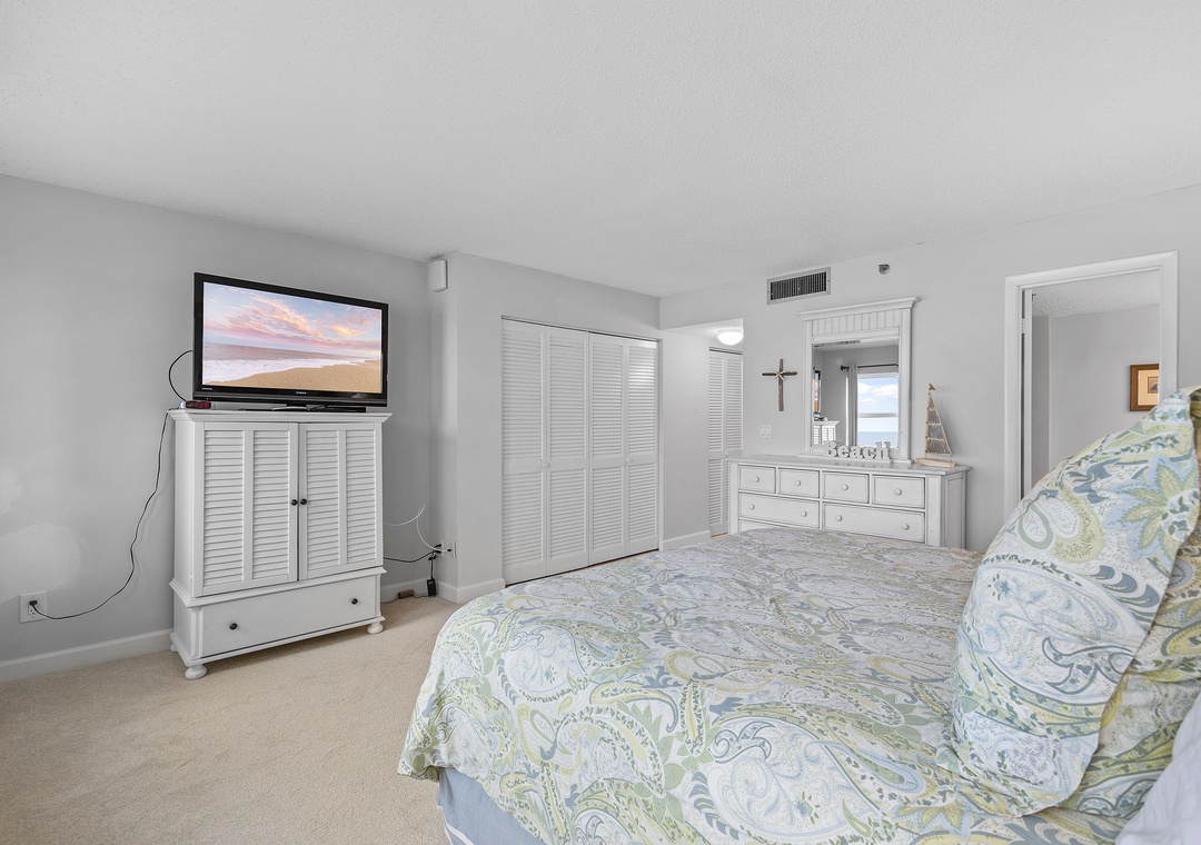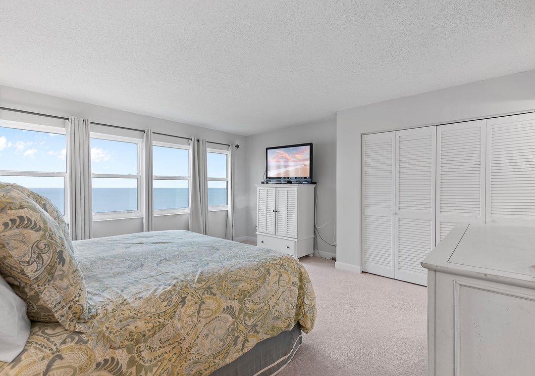 Indulge in the breathtaking oceanfront view as you wake up each morning in the primary bedroom. This serene and inviting space is adorned with a calming coastal ambiance, creating the perfect atmosphere for rest and relaxation throughout your stay. The bedroom is furnished with a comfortable king-sized bed, a dresser for your belongings, and a TV for entertainment. Enjoy the convenience of the adjoining bathroom, ensuring privacy and convenience. Allow the soothing sounds of the ocean and the tranquil atmosphere of the primary bedroom to envelop you in tranquility and make your beachside getaway truly unforgettable.