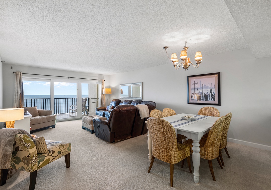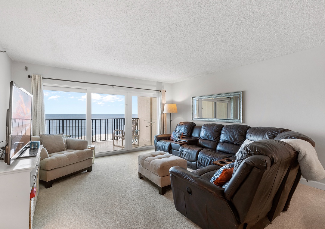 Experience pure comfort as plush, bright carpeting spreads across the entire condo, creating a cozy and inviting atmosphere. Alongside the captivating oceanfront view, the living space is thoughtfully furnished with a spacious leather sectional, a luxurious lounge chaise, and a large Smart TV. Whether you're relaxing with a book, enjoying quality time with loved ones, or indulging in your favorite shows or movies, this well-appointed living area provides the perfect setting for ultimate relaxation and entertainment.