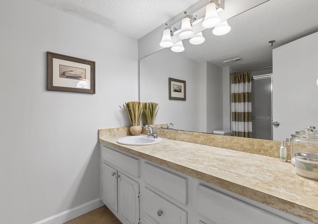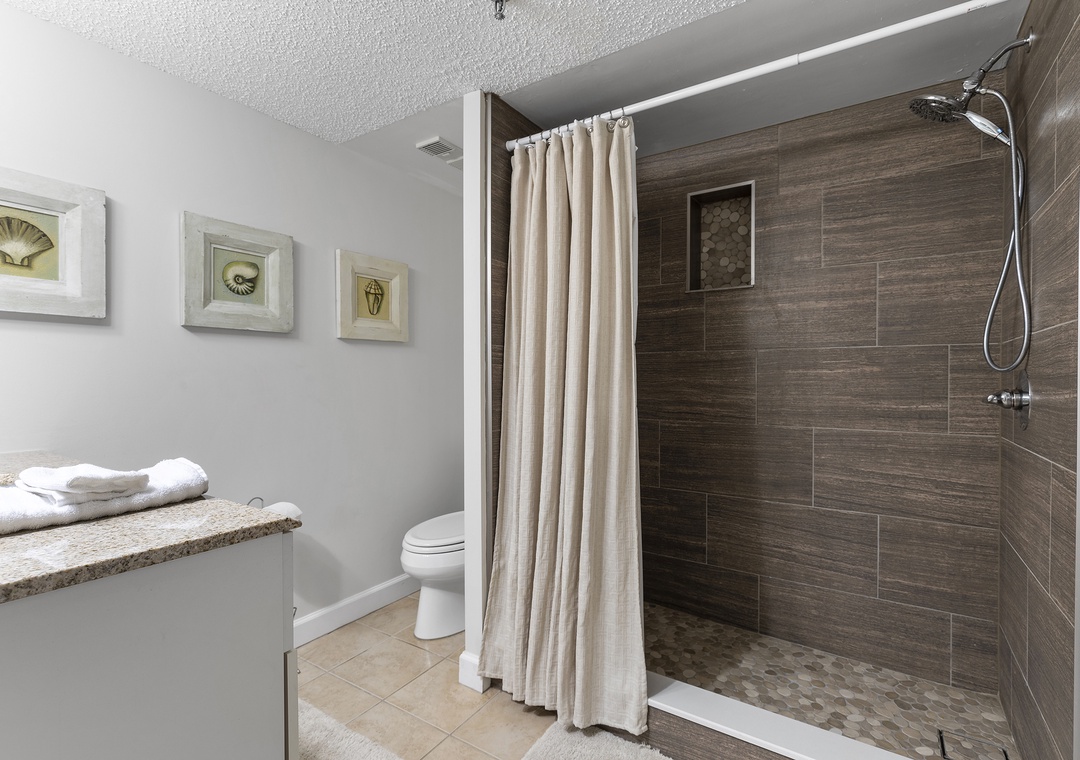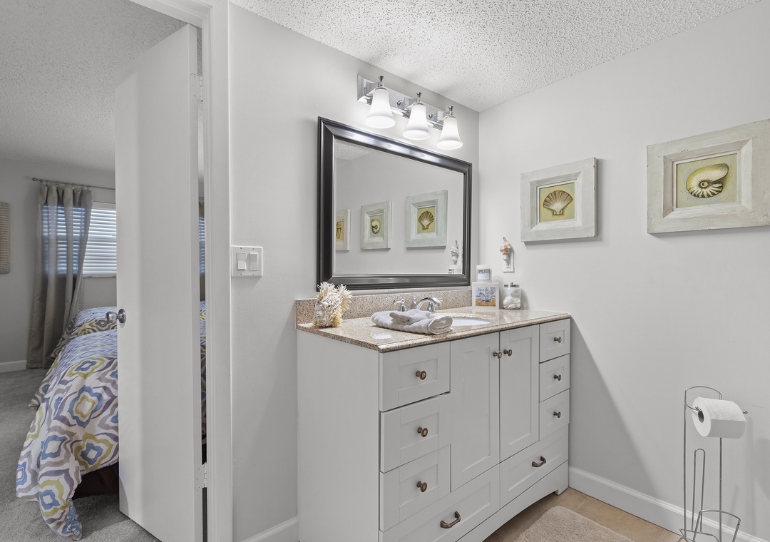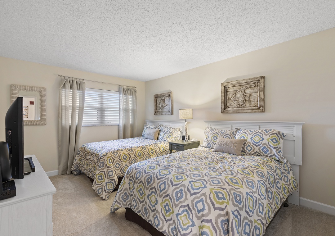 The second bedroom welcomes guests with two comfortable queen beds, providing ample space for four guests to relax and unwind. A TV is also available in the room for your entertainment. Natural light pours in through the large window, illuminating the space and creating a warm and inviting atmosphere. Whether you're enjoying a peaceful afternoon nap or getting ready for a day of adventure, the second bedroom offers a comfortable and rejuvenating retreat. Adjacent to the second bedroom, the convenience continues with a nearby second bathroom.