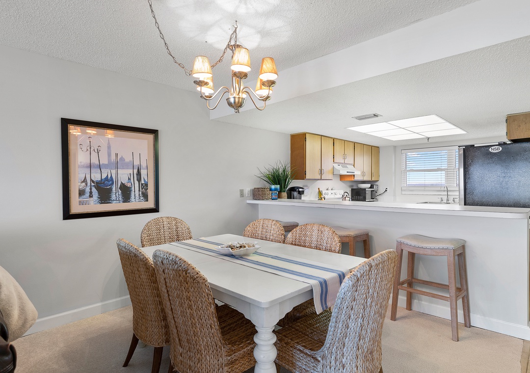 The open-concept flow of the condo allows the living room to flow effortlessly into the dining room. The coastal ambiance carries through to this area, where you'll find a spacious white rectangular table surrounded by six beautifully woven chairs. This charming dining setup creates an inviting space for enjoying delicious meals and engaging conversations. Whether you're gathering for a family dinner or hosting a social gathering, the combination of the open layout and coastal-inspired furnishings ensures a warm and welcoming atmosphere.