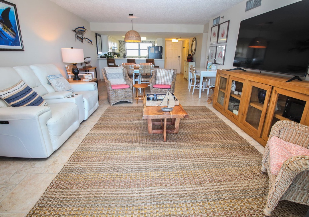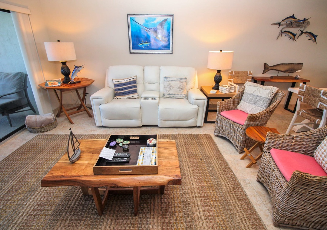 Throughout the day, your group will gravitate to the adorably chic living room. Wicker accent chairs and a leather reclining couch make it an enticing place to rest. Once you've picked your spot, you can relax to the view of the ocean or a show on the 55" TV equipped with cable, a Blu-Ray player, and streaming service apps. Those who work remotely can meet deadlines using the high-speed internet at the nearby desk.