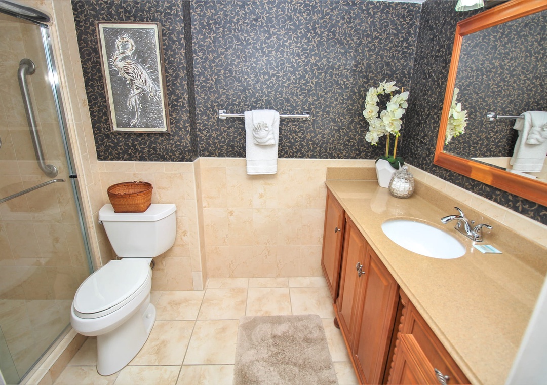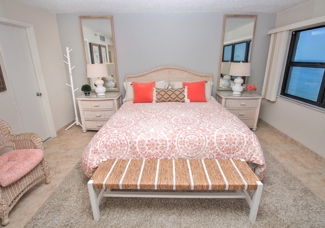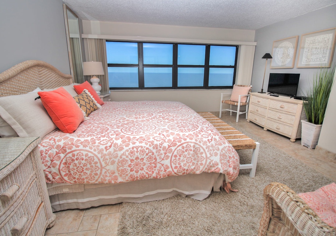 If you're not an early bird, you can witness the sunrise from the comfort of the primary suite's king bed. This bedroom has a large oceanfront window, flat-screen TV, and beachy wicker accents throughout. The adjoining bathroom has a walk-in shower with a grab bar, a large vanity, and plenty of bath towels.