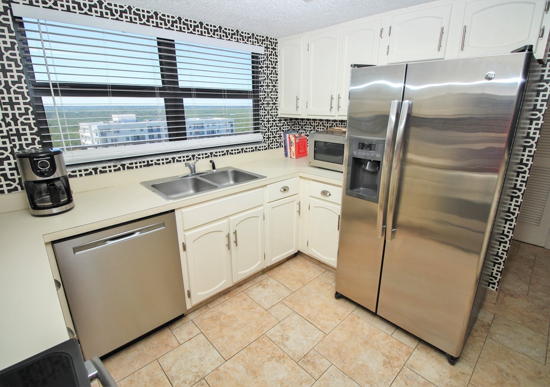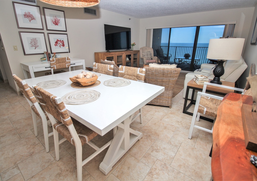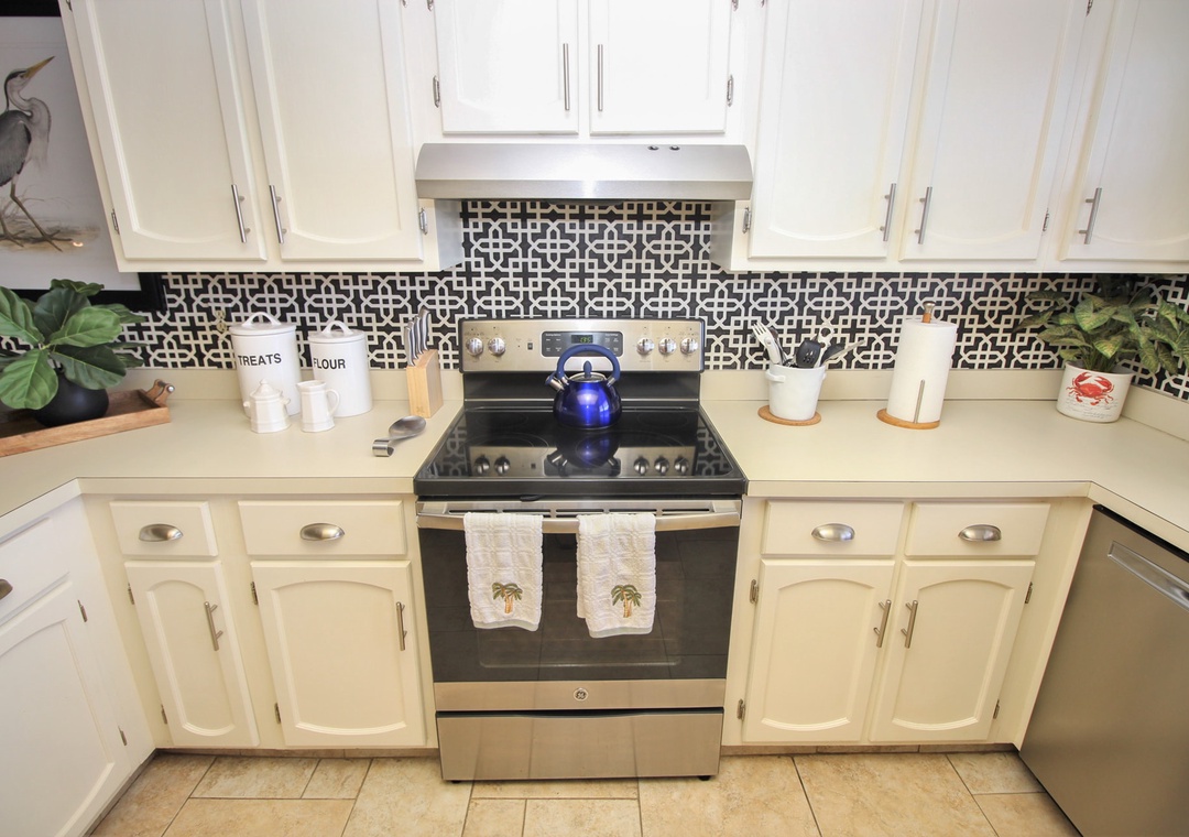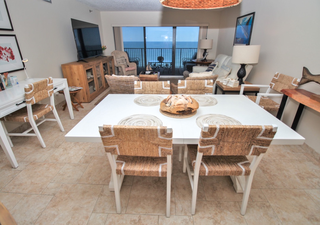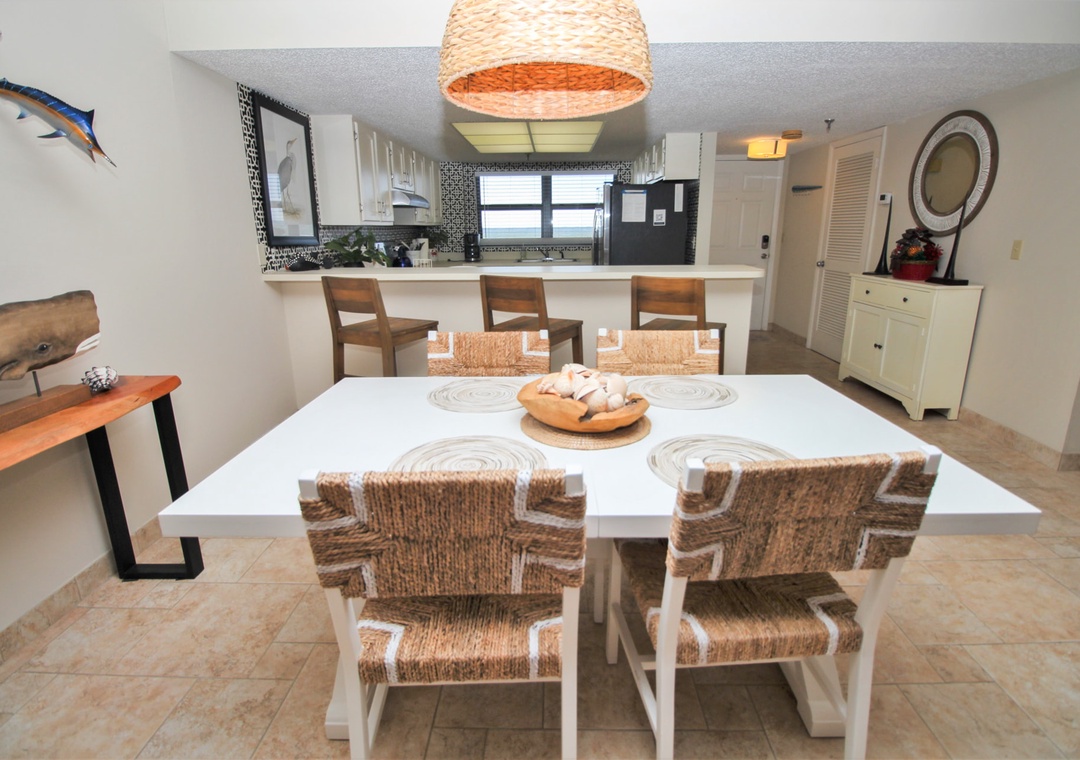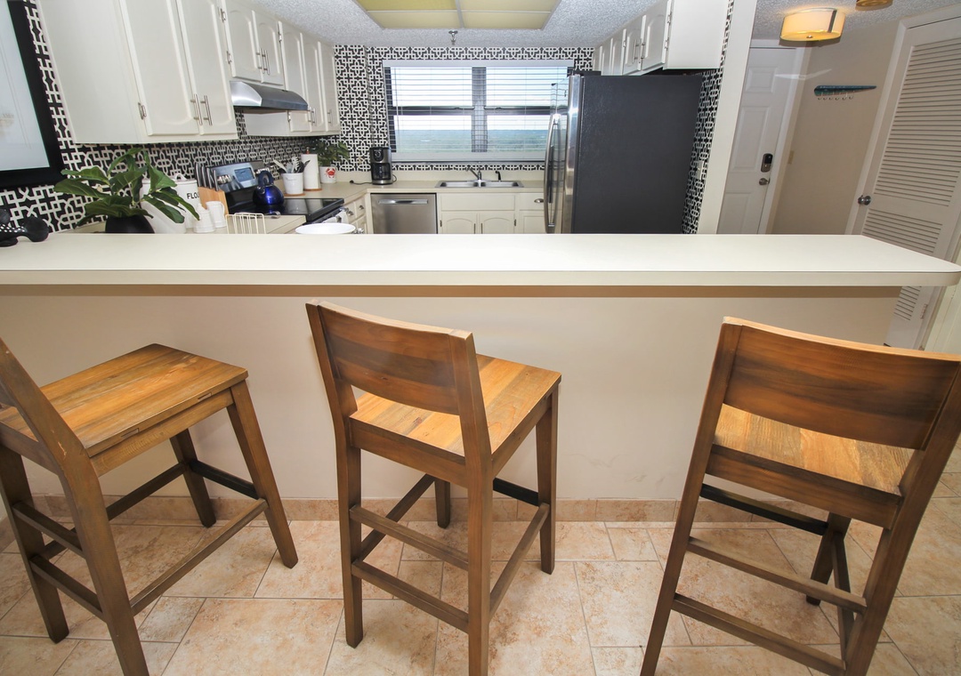 Fuel up for a day of beachy fun by stepping into the kitchen for a bite. Even if cooking isn't your forte, you'll feel inspired to try in such a beautiful space. Light cabinetry, stainless steel appliances, and a fun backsplash make the kitchen feel chic. Your favorite amenities such as a drip coffee maker, kettle, griddle, and more are provided to make meal prep a breeze. Two dining options are provided within the condo. Quick meals can be served at the breakfast counter for three and formal dining can be held at the farmhouse table for six.