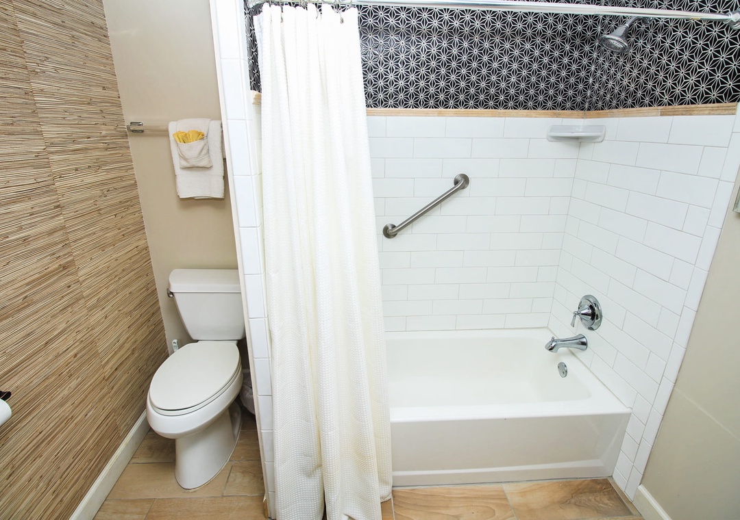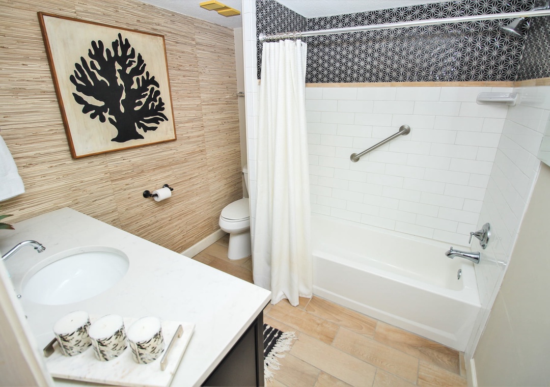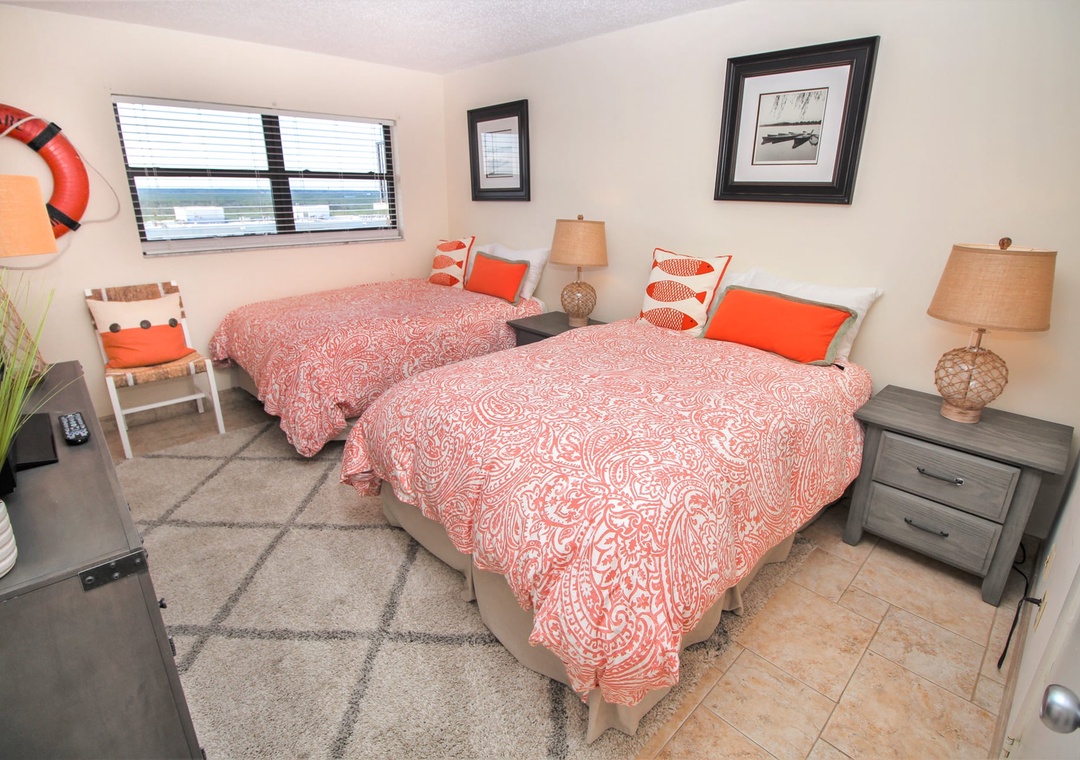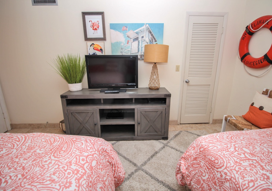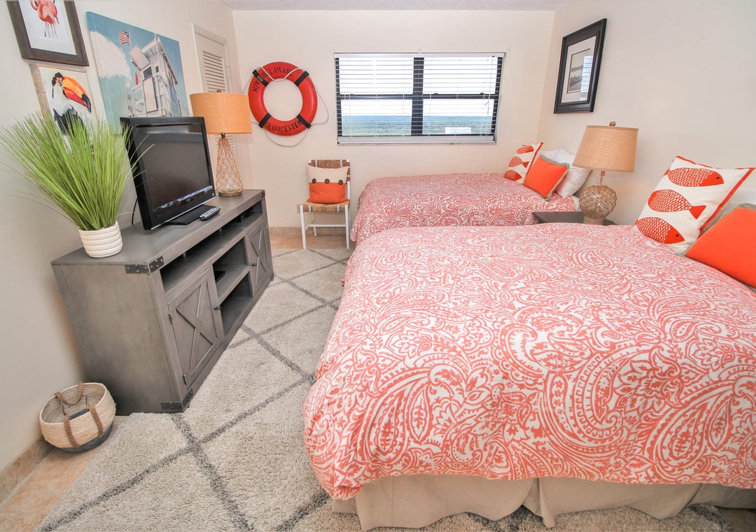 The second bedroom offers a similar experience with cute coastal décor, a 24" TV, and two full beds. It has a striking bathroom that boasts of a beautifully tiled bathtub/shower, wood-grain wallpaper, and soft bath towels.