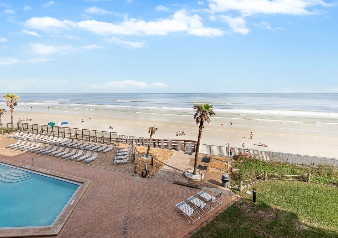 Sunrise Condominium, located in New Smyrna on the no-driving, turtle-friendly section of New Smyrna Beach, offers beachgoers a delightful experience with its spacious, 2 and 3-bedroom oceanfront condos, large balconies, and abundant amenities. The beachy, coral-colored building stands eight stories high. The condo has an elevator, and the oceanfront location makes walks to the beach an easy endeavor. Amenities include the beautiful seasonally heated oceanfront swimming pool, an oceanfront sundeck, tennis, shuffleboard, and basketball courts, a two-level parking garage, and even gas grills for cookouts.