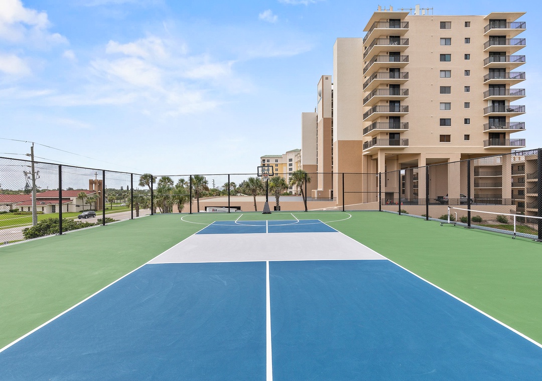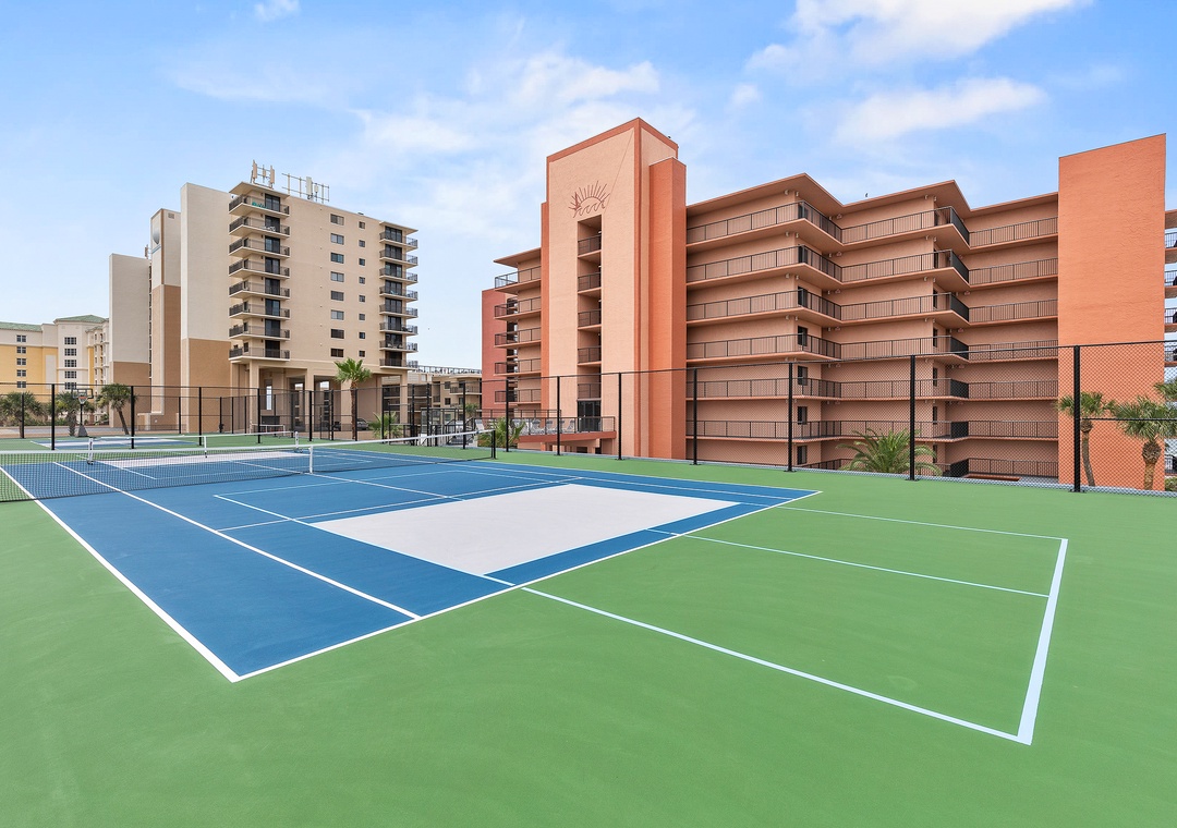 Sunrise Condominium, located in New Smyrna on the no-driving, turtle-friendly section of New Smyrna Beach, offers beachgoers a delightful experience with its spacious, 2 and 3-bedroom oceanfront condos, large balconies, and abundant amenities. The beachy, coral-colored building stands eight stories high. The condo has an elevator, and the oceanfront location makes walks to the beach an easy endeavor. Amenities include the beautiful seasonally heated oceanfront swimming pool, an oceanfront sundeck, tennis, shuffleboard, and basketball courts, a two-level parking garage, and even gas grills for cookouts.
