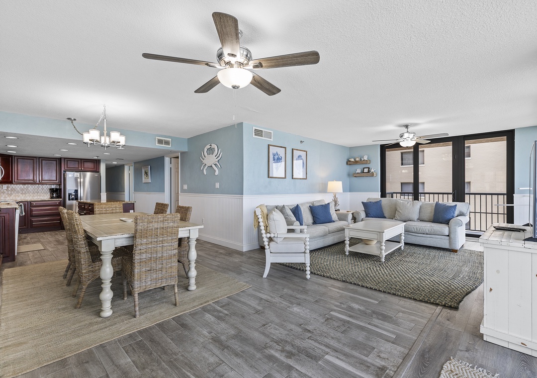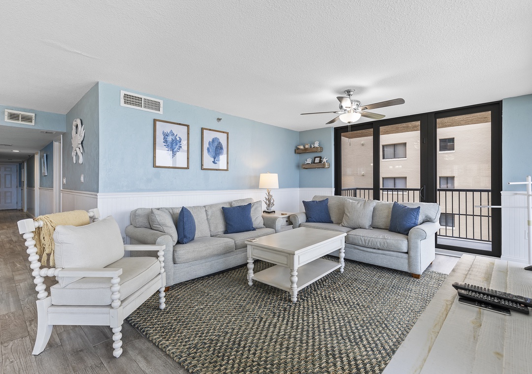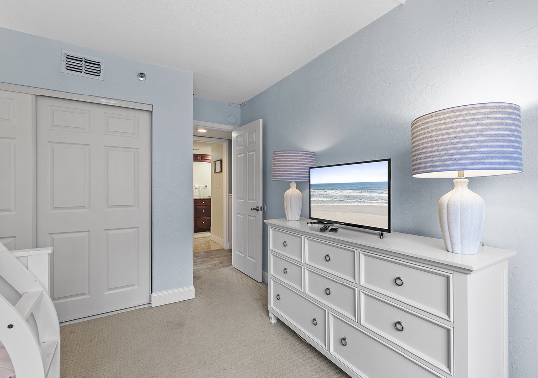 Welcome to the Sunrise 309 a three-bedroom/ two-bathroom luxury air-conditioned condo that sleeps up to eight comfortably. The welcoming living room has a large flat-screen TV with cable, free Wi-Fi, and lots of comfortable furniture. Walls of sliding glass doors open onto the balcony where the Atlantic Ocean stretches out before you. Picture lounging on one of the balcony chairs and watching the sunrise each morning while you enjoy a cup of coffee. The kitchen has everything you need to prepare excellent meals for your family. The primary bedroom has a king bed with balcony access. The guest bedroom 1 has a queen bed and guest bedroom 2 has a twin over full bunk bed with a trundle. This unit has a laundry room with a full-size washer and dryer so you can keep your family in clean clothes throughout your stay and a sleeper sofa is provided for additional sleeping. Come see why the fun never stops at Sunrise 309!