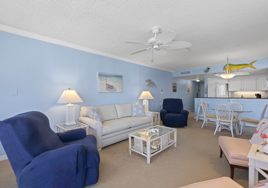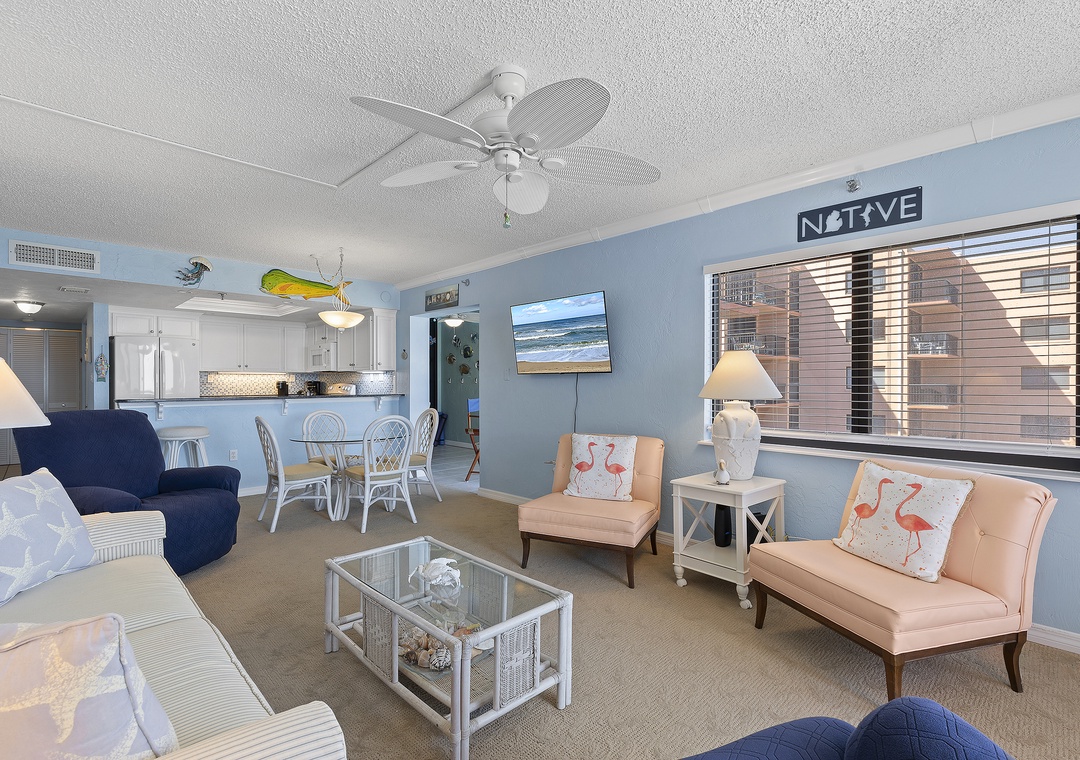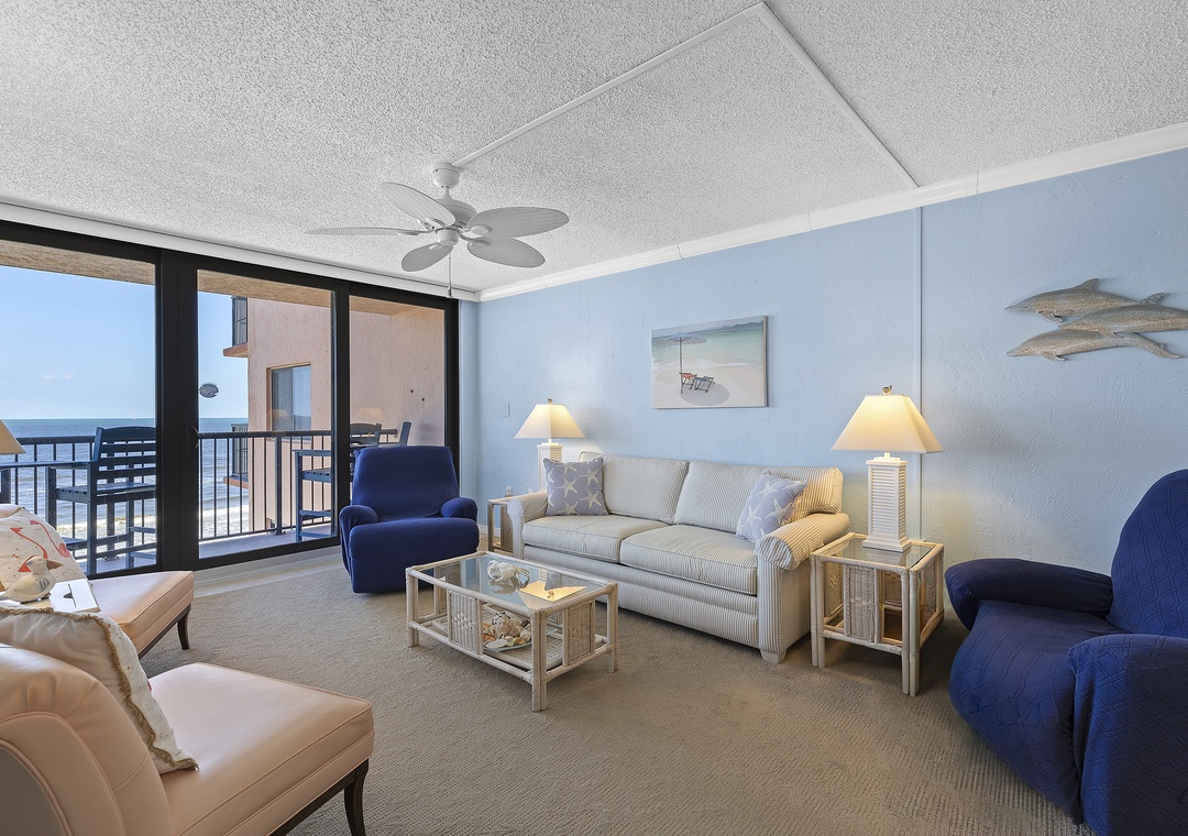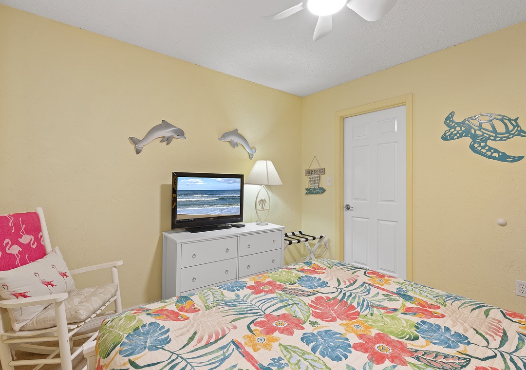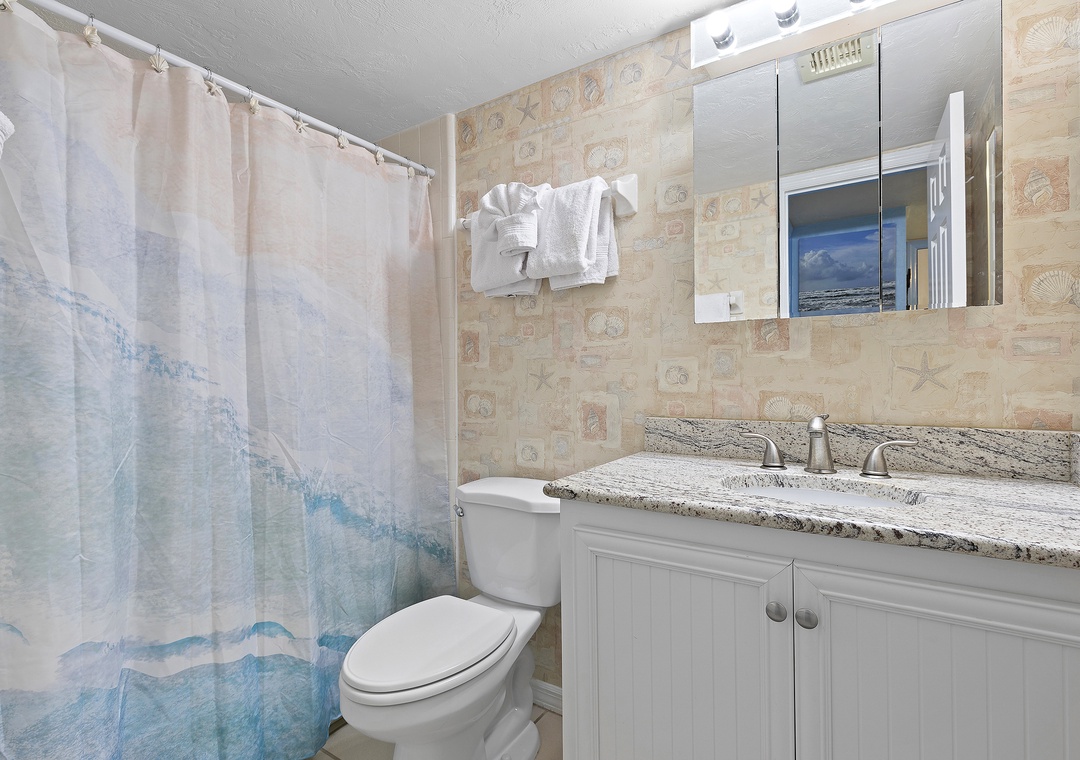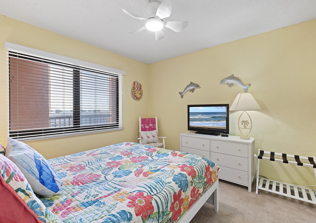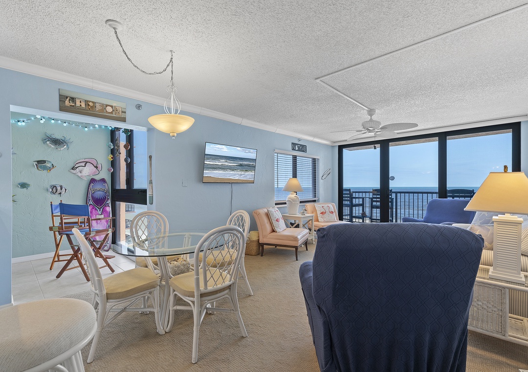 Welcome to Sunrise 602! Your beachy oceanfront getaway awaits in this spacious 6th-floor condo with stunning views of the Atlantic. Step out onto the balcony and soak in the breathtaking sights and sounds of the ocean. The living room offers a cozy retreat with a TV, free Wi-Fi, and a sleeper sofa. The well-equipped kitchen is ready for you to whip up your favorite meals. The primary bedroom features a comfortable king bed, an ensuite bathroom, and a separate toilet area for added privacy. The guest bedroom includes a queen bed, a TV, and a walk-in closet.