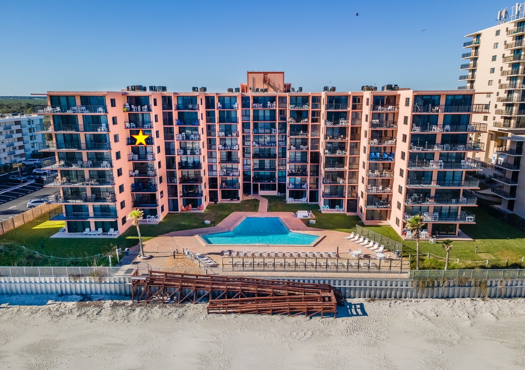 Sunrise Condominium, located in New Smyrna on the no-driving, turtle-friendly section of New Smyrna Beach, offers beachgoers a delightful experience with its spacious, 2 and 3-bedroom oceanfront condos, large balconies, and abundant amenities. The beachy, coral-colored building stands eight stories high. The condo has an elevator, and the oceanfront location makes walks to the beach an easy endeavor. Amenities include the beautiful oceanfront swimming pool, an oceanfront sundeck, tennis, shuffleboard, and basketball courts, a two-level parking garage, and even gas grills for cookouts.