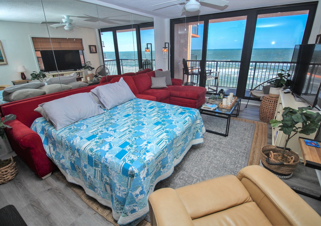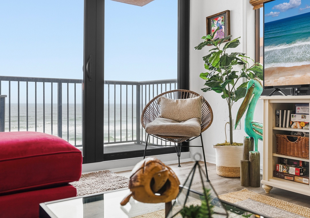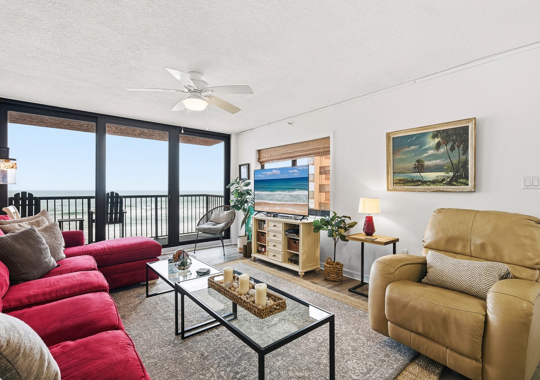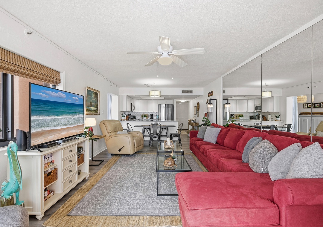 When you need a quick rest from the Florida heat, curl up on the living room's L-shaped sofa for a peaceful nap. The living room tastefully balances trendy décor, soft accents, and a bold red pop of color. Once you're cozy on the queen sleeper sofa, turn on the large flat-screen TV let the sounds of your favorite show, and the sliding-glass view of ebbing tides gently lull you to sleep.