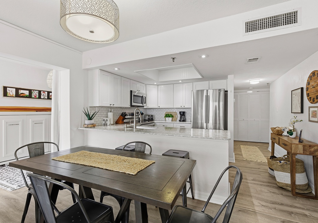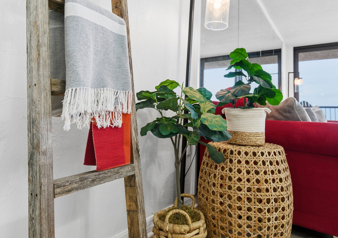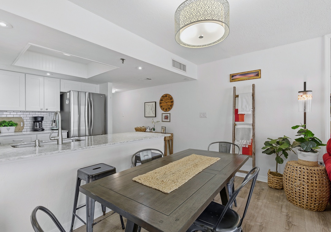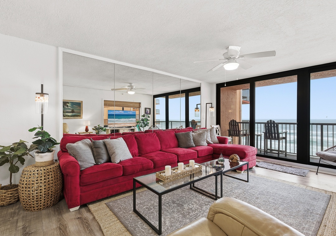 When you need a quick rest from the Florida heat, curl up on the living room's L-shaped sofa for a peaceful nap. The living room tastefully balances trendy décor, soft accents, and a bold red pop of color. Once you're cozy on the queen sleeper sofa, turn on the large flat-screen TV let the sounds of your favorite show, and the sliding-glass view of ebbing tides gently lull you to sleep.