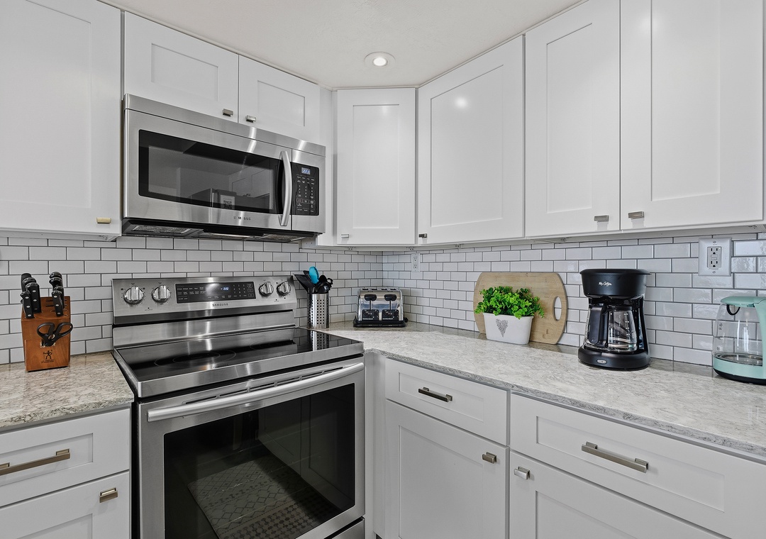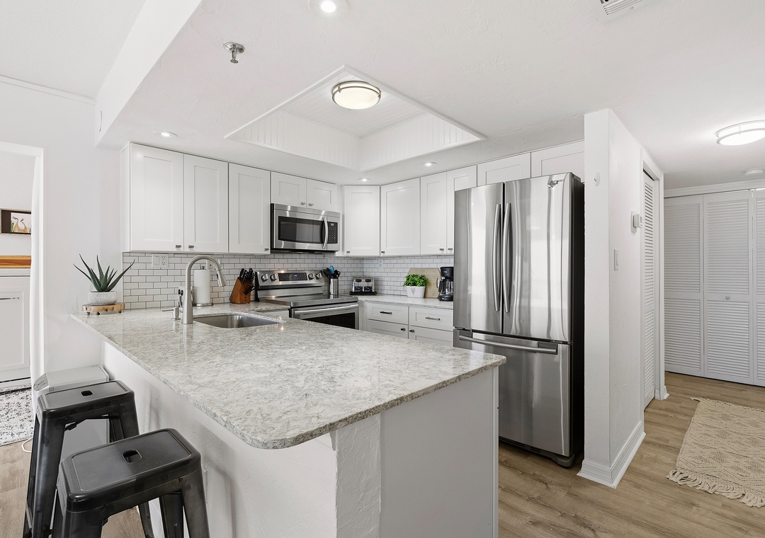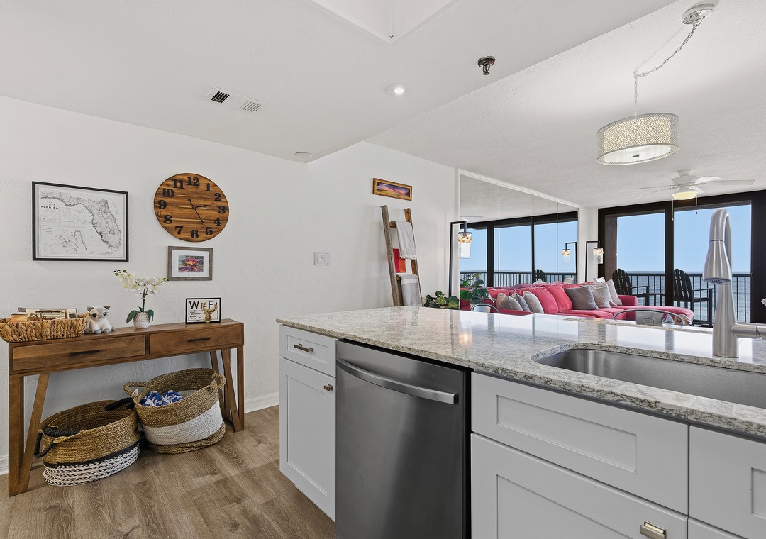 Before you rush to the oceanfront balcony, notice the custom details and features that create this condo's luxury atmosphere. On your right, you'll find a dreamy, white kitchen that you get to call "yours" during your stay. This magazine-worthy space is filled with top-of-the-line features such as stainless-steel appliances, marbled granite counters, white cabinetry, and subway tile backsplash. Whether you're brewing your morning cup in the drip coffee maker or prepping a gourmet dinner at the counter, you'll love how cooking essentials and a salt-water view are always provided in the kitchen.