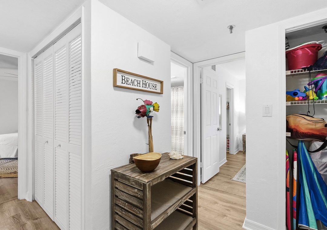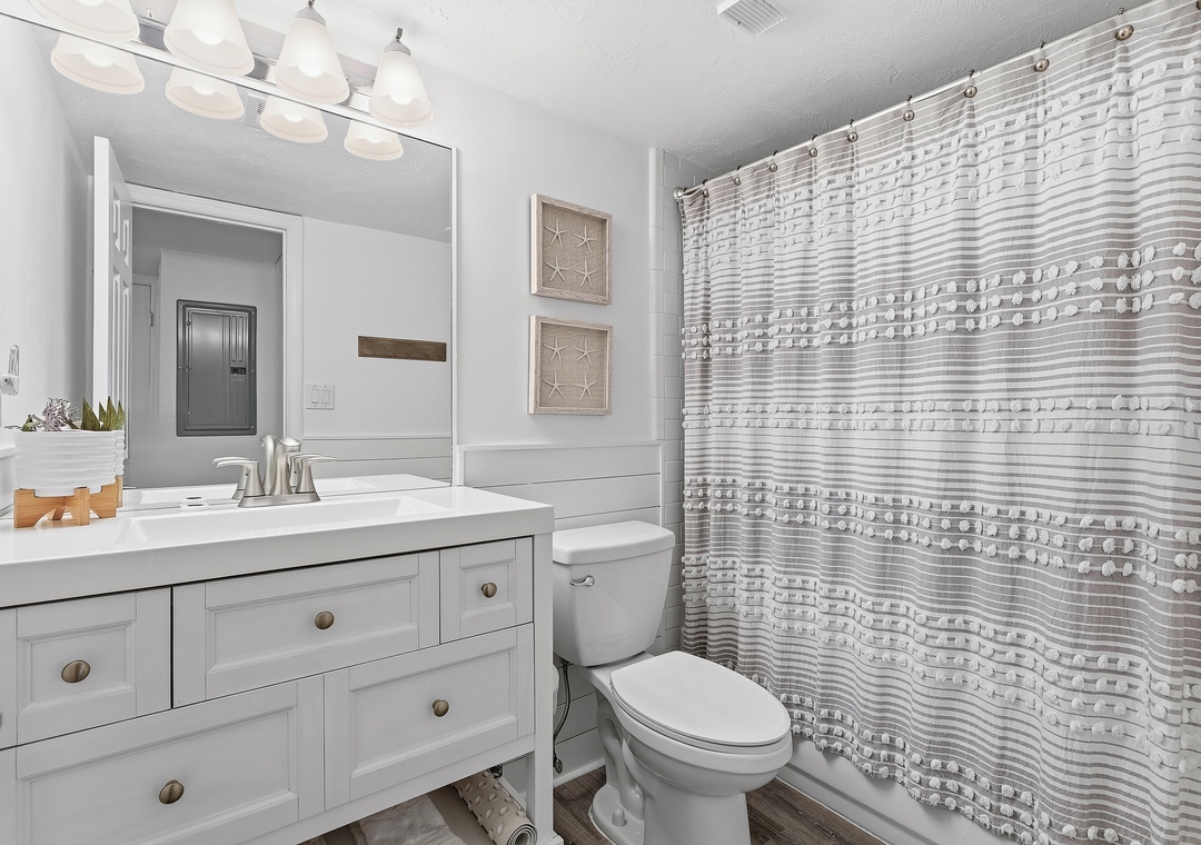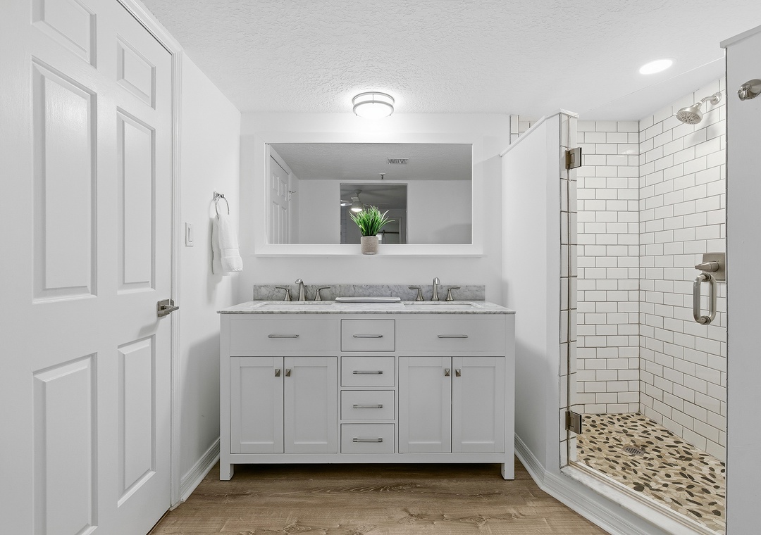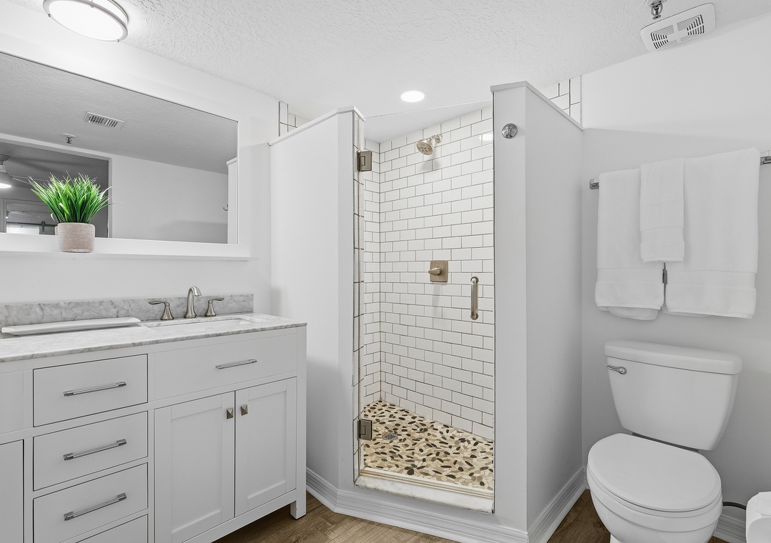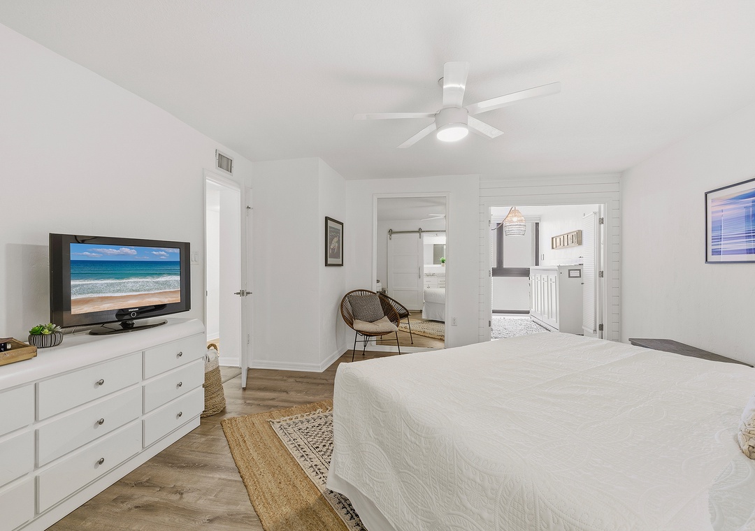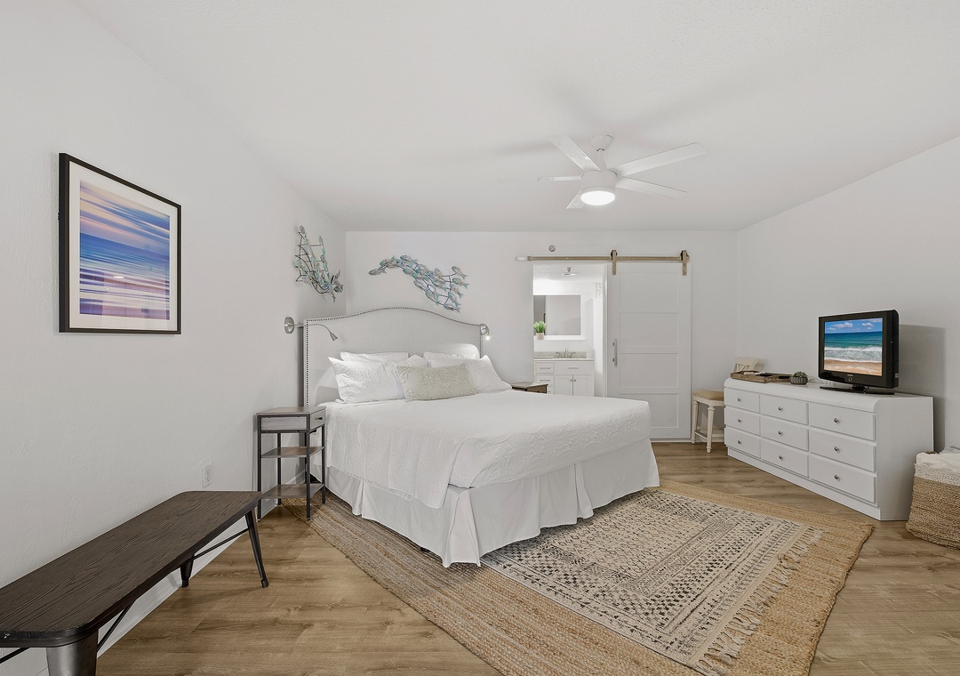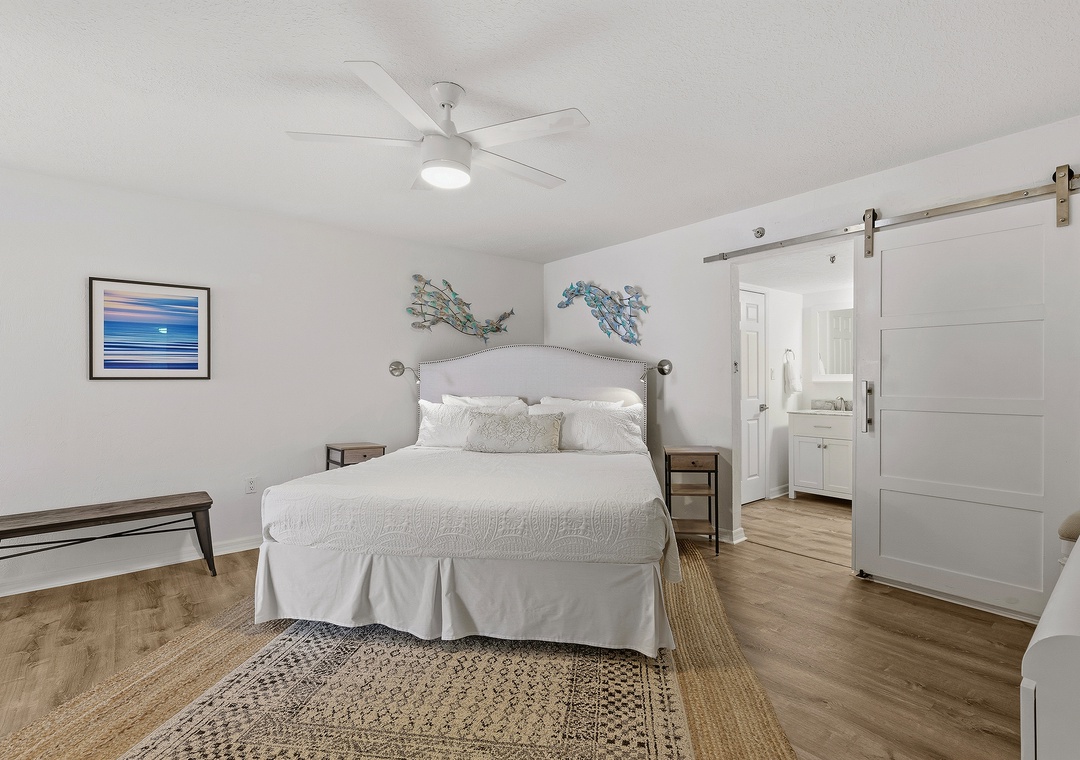 While your vacation nighttime routine will mainly consist of last-minute ice cream runs and long walks on the moonlit beach, you'll love how a beautiful primary bedroom awaits you at the end of each fun-filled night. Arrayed in creams, light greys, and gentle textures, the king bed is certainly the cozy focal point of the bedroom. Snuggle under the covers with a loved one and end the perfect day with your favorite movie on the flat-screen TV. Slip through the farmhouse door to behold the dreamy primary bathroom. With a custom-tiled walk-in shower, a double vanity with granite counters, and plenty of plush linens, you'll find you've never loved a bathroom more.