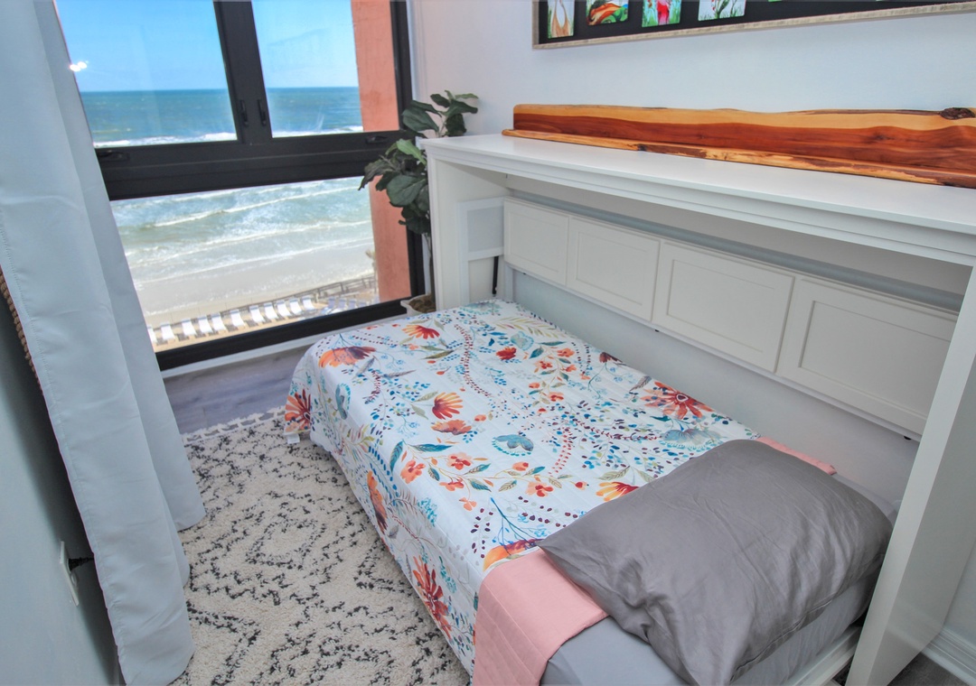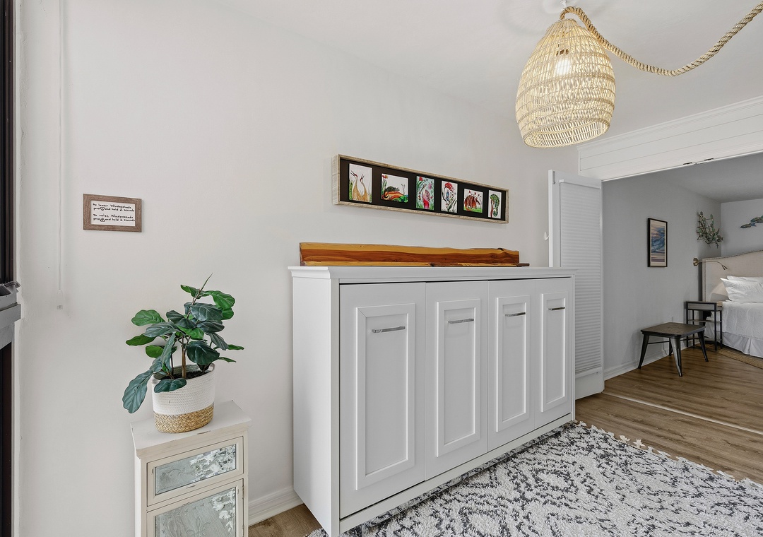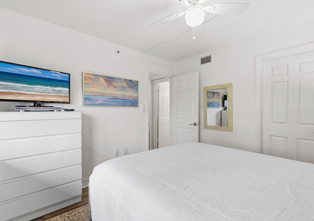 While you enjoy the luxuries of the primary suite, your guests will equally love their accommodations. Tucked away between the dining room and primary bedroom is a little sunroom nook with a cabinet that converts into a twin bed. Though not a traditional guest bedroom, your family will all want to call this space theirs as it boasts of a large window view of the ocean. A true second bedroom is located nearby and holds a queen bed, a flat-screen TV, and plenty of dresser space. The guest bathroom is equally as beautiful as the primary bathroom with its subway tiling in the standard tub, beautiful white vanity, and tasteful décor.