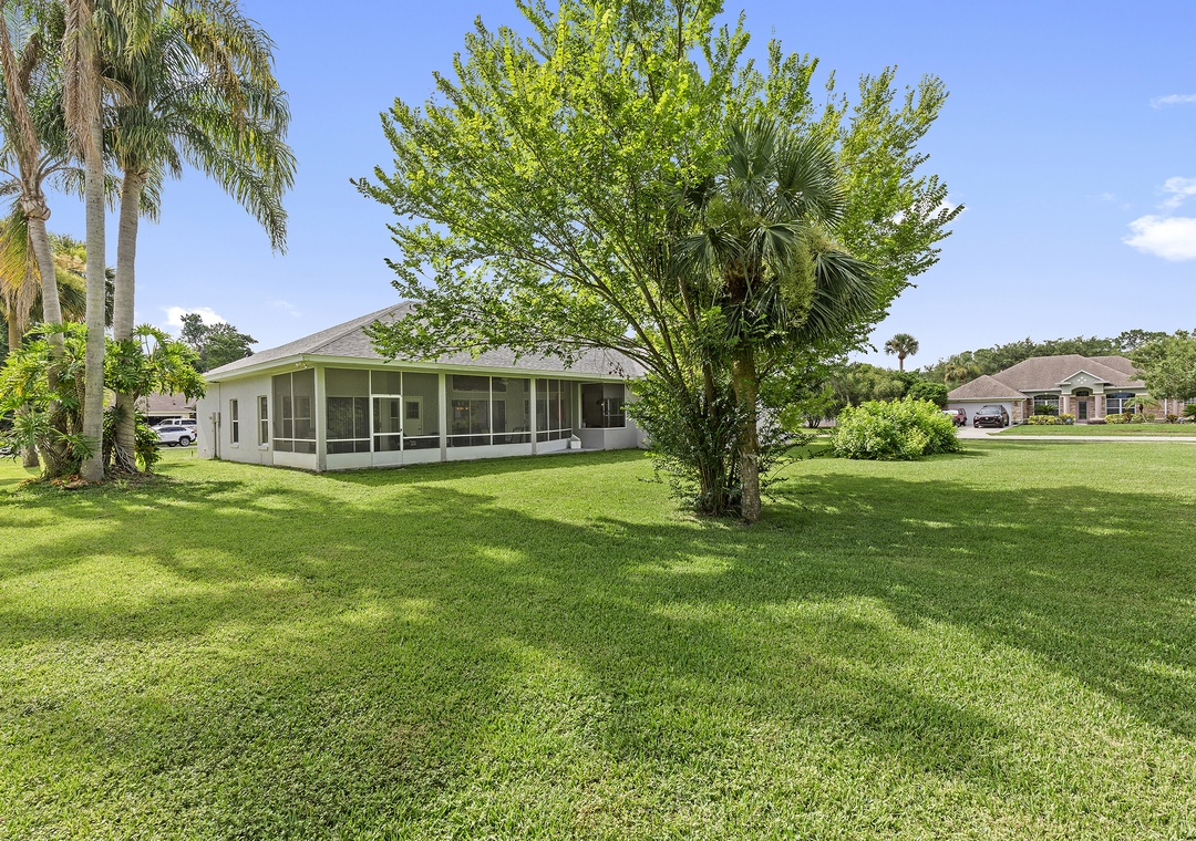 Welcome to Sunrise Oaks! Just minutes from Daytona Beach, this spacious 4-bedroom, 3-bath home is perfect for families, retirees, and pet owners. The open floor plan features wood and ceramic tile flooring, vaulted ceilings, and an updated kitchen with granite countertops and stainless-steel appliances. A formal dining room seats eight, while a cozy breakfast nook offers garden views. The living room provides comfortable seating, a flat-screen TV, a fireplace, and an upright piano. Step outside to a screened-in porch with a gas grill and plenty of seating for outdoor dining and relaxation.