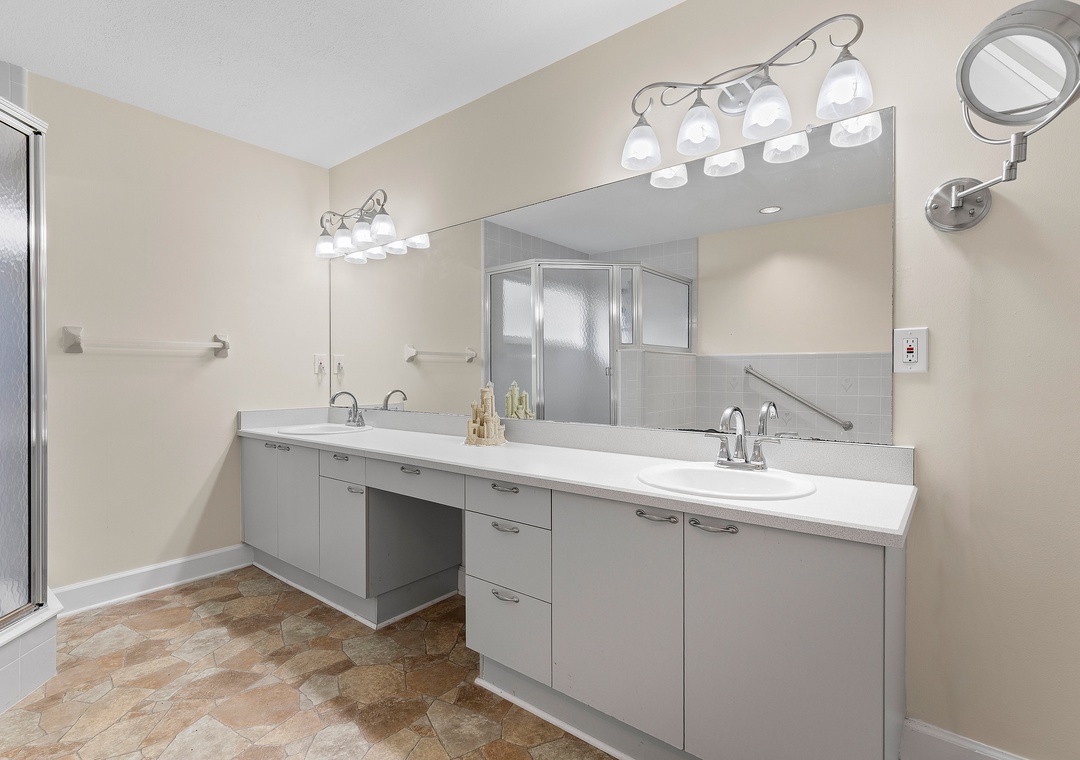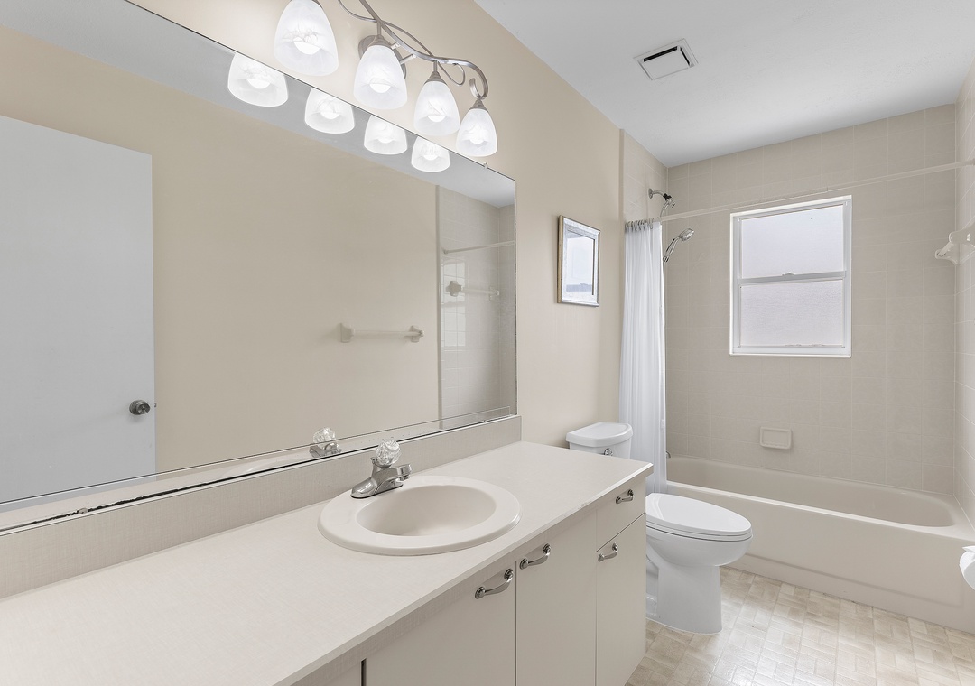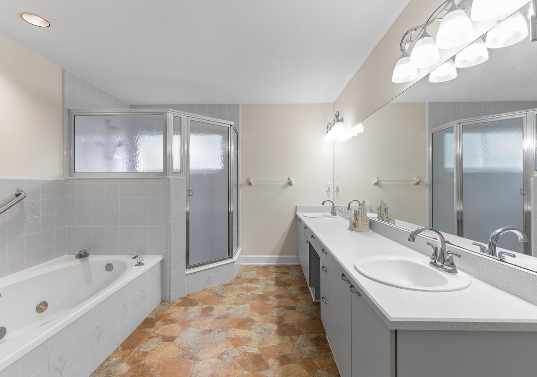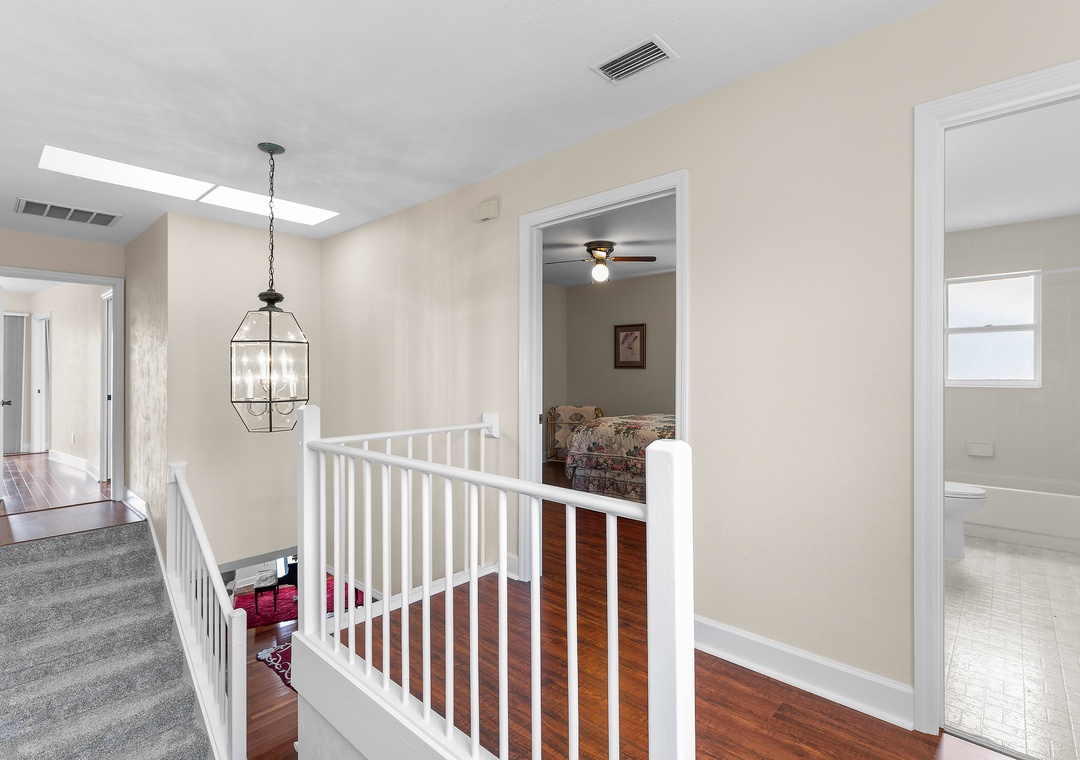 West Wing: Has 2 additional Queen bedrooms, bathroom with tub/shower combo, and private stair access to the pool area, offering easy indoor-outdoor living for guests or family.