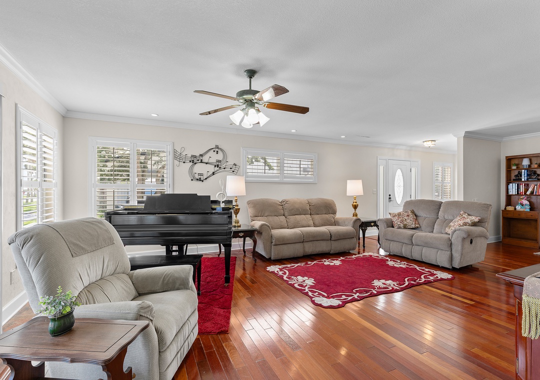 Inside, the large living room with Steinway piano, flows seamlessly into a well-equipped kitchen and dining room, perfect for entertaining or quiet evenings at home. The wheelchair accessible bedroom offers two twin beds, roll in shower bathroom and sliders leading to an uncovered porch. The laundry room adds everyday functionality, while the 1 car garage with wheelchair ramp leading into the house offers convenience. The screened in veranda accessed from living room and dining room is ideal for a serene escape to enjoy a morning cup of coffee.