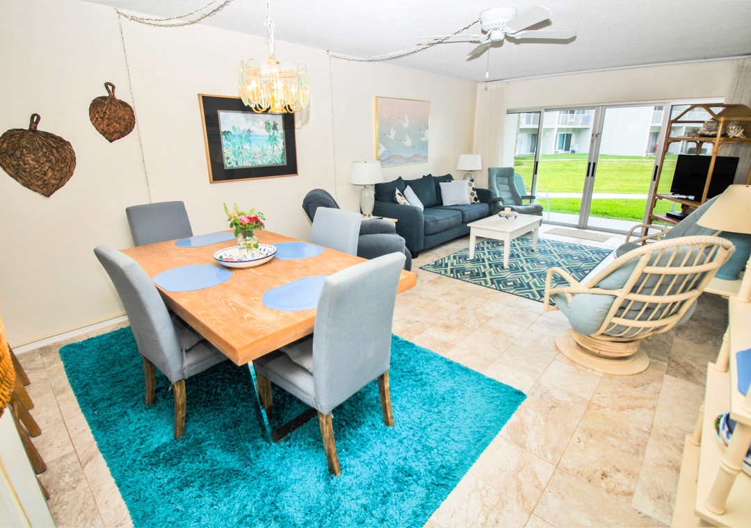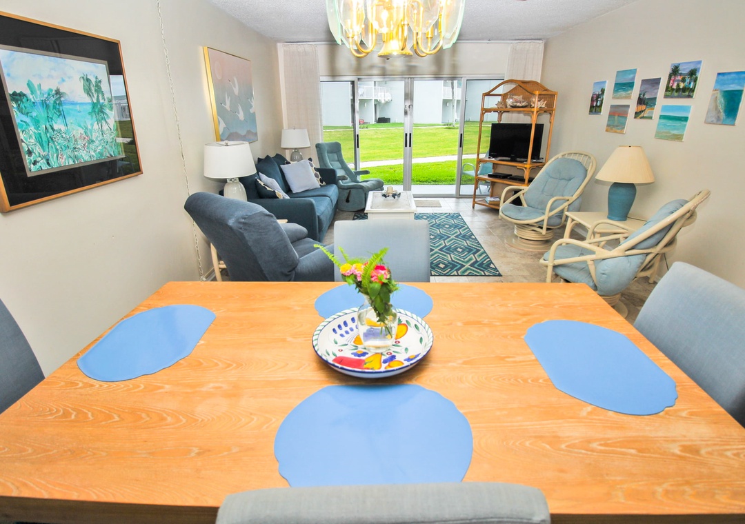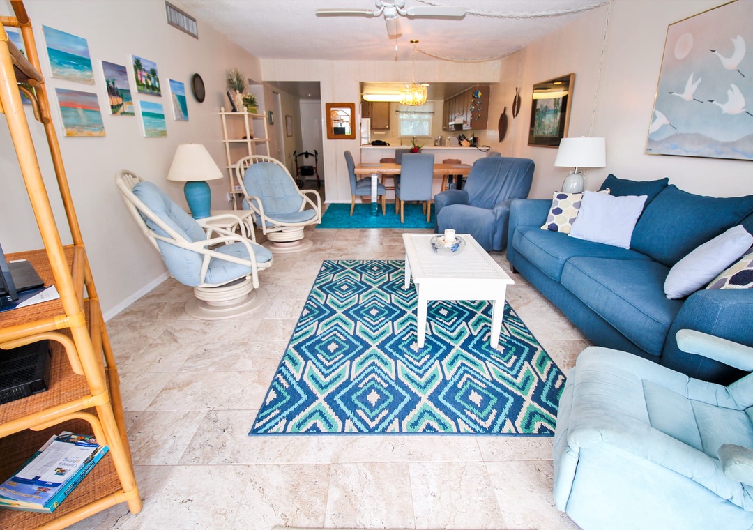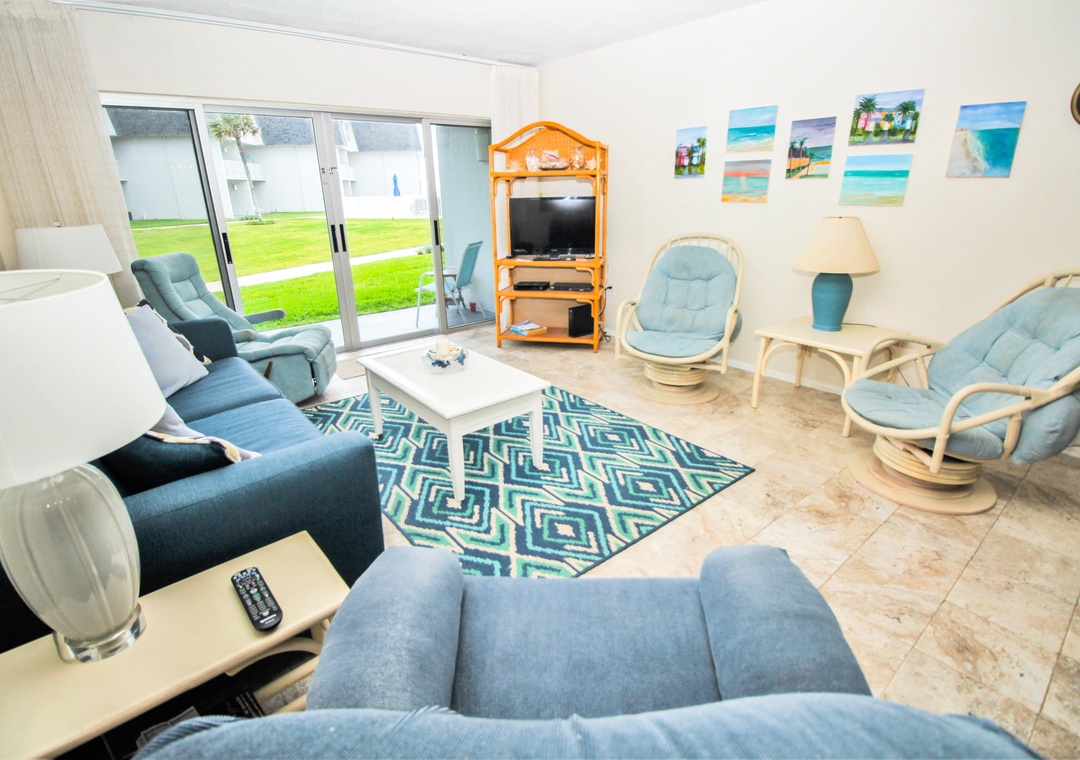 When you're not exploring Flagler Avenue or reading by the pool, you'll love kicking back in the living area. This room is well furnished with a pull-out couch, two recliners, and two armchairs. You can catch your favorite shows on the 32" TV that's equipped with cable.