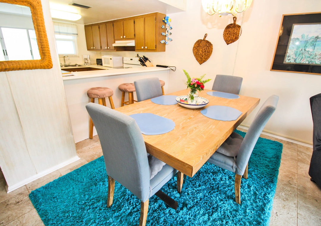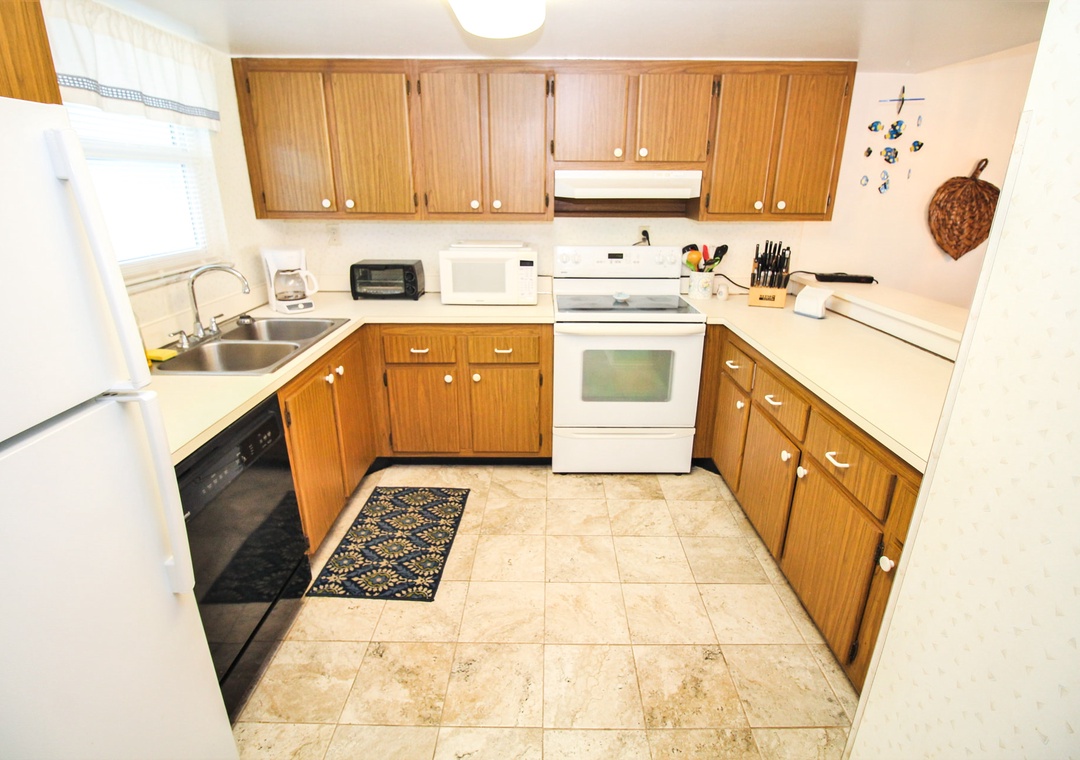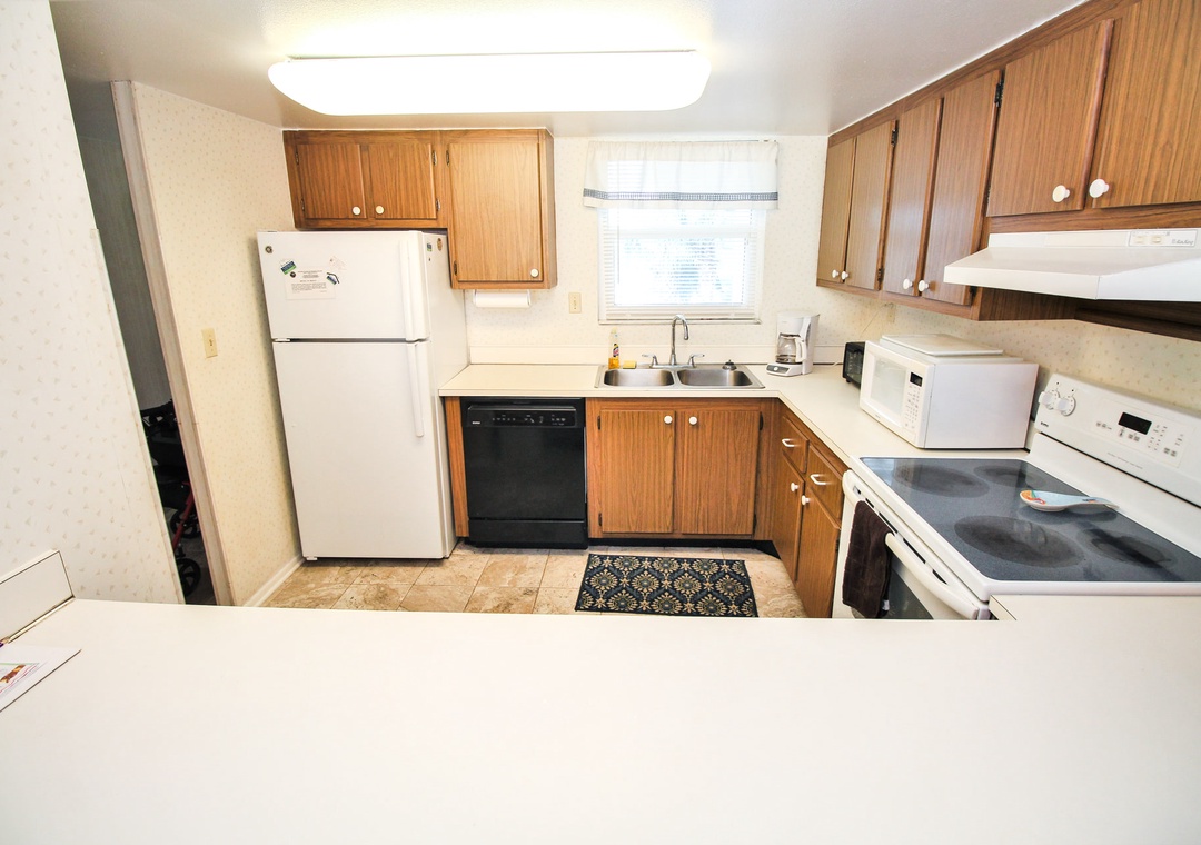 Venture into the kitchen to put away your groceries. This space has brown wood cabinetry, white appliances, and all the essentials you need. You'll find cookware, dinnerware, a drip coffee maker, toaster oven, crockpot, blender, and more provided. When you're ready to eat, you can either sit at the breakfast bar for three or dining table for four.
