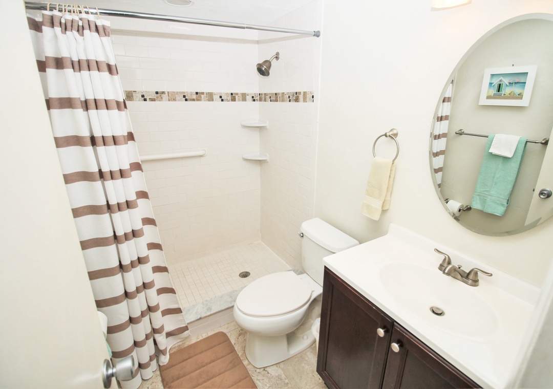 At the end of each fun-filled day, you'll be ready to retire in the primary bedroom. This room holds a king bed, 32" TV, workspace with a printer, and private balcony access. The nearby bathroom has a walk-in shower with a grab bar.