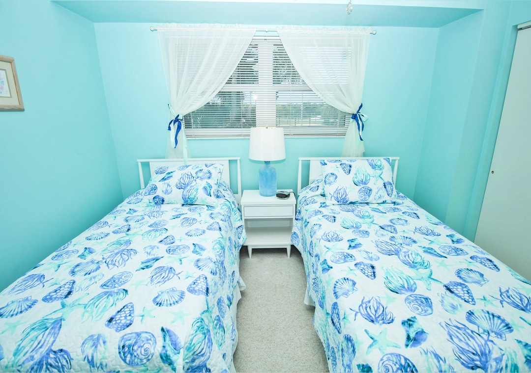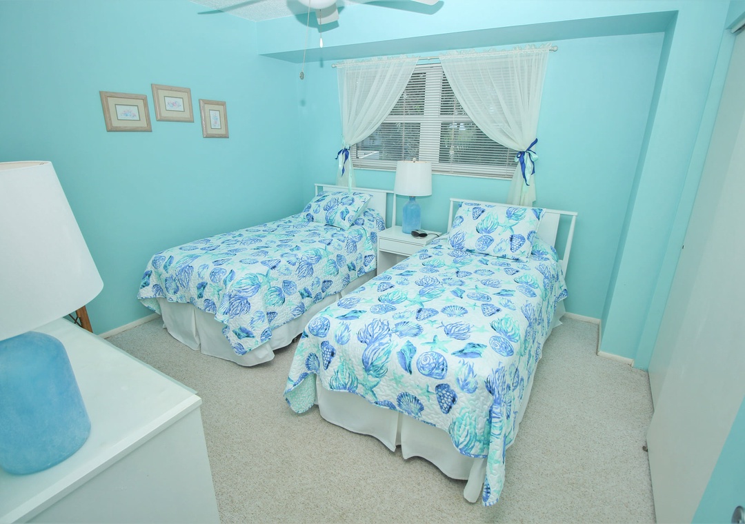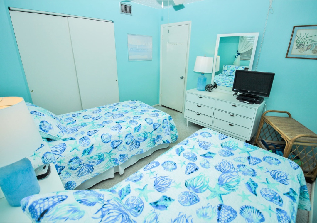 Two others can sleep in the second bedroom which holds two twin beds and a TV. The guest bathroom has a standard bathtub and plenty of bath linens.