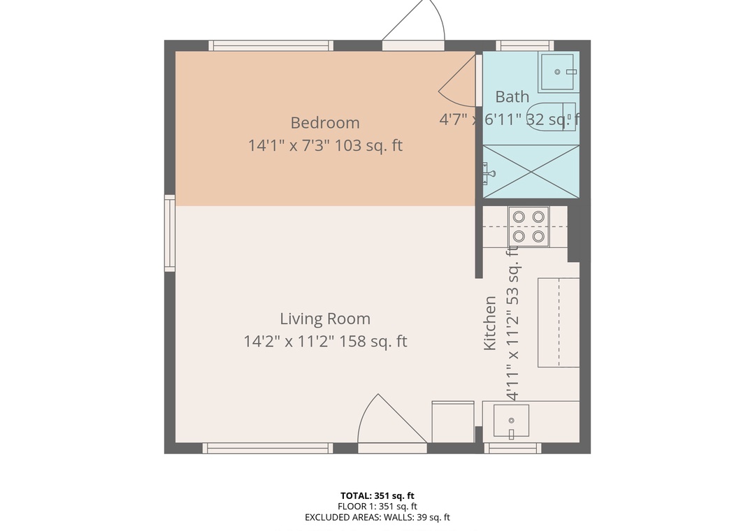 Inside, you’ll find a comfortable queen bedroom and a sleeper sofa, ideal for couples, solo travelers, or small families. The space includes a full bathroom with shower and kitchen equipped for preparing meals.