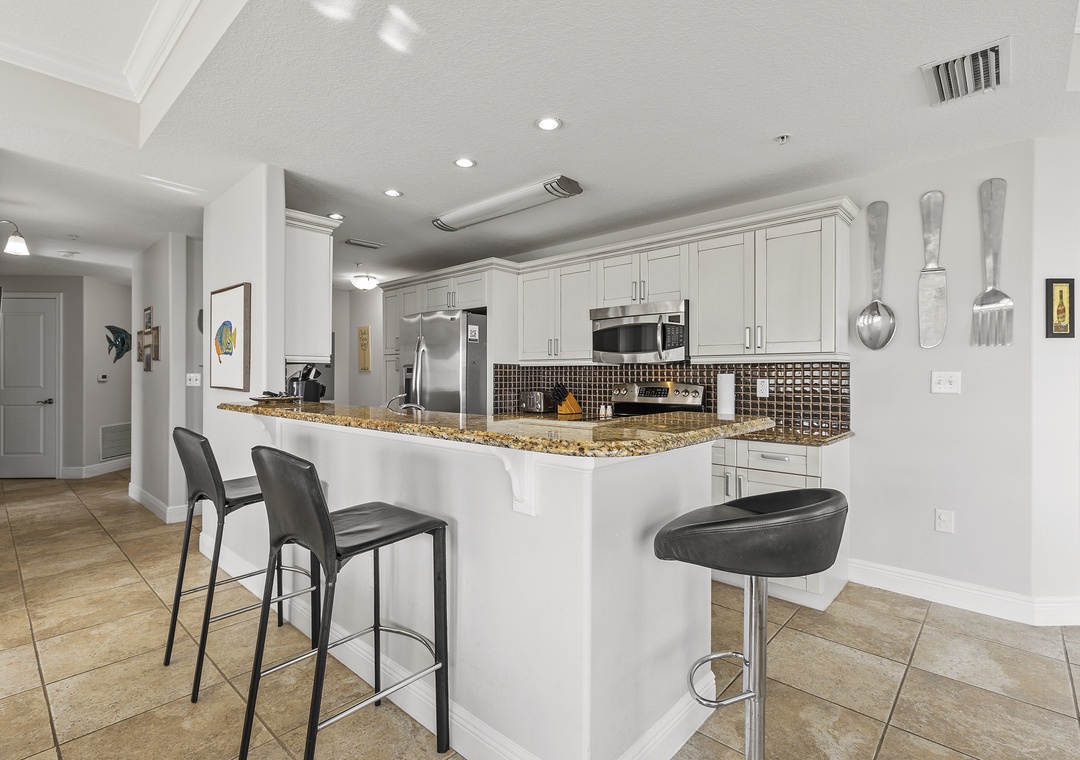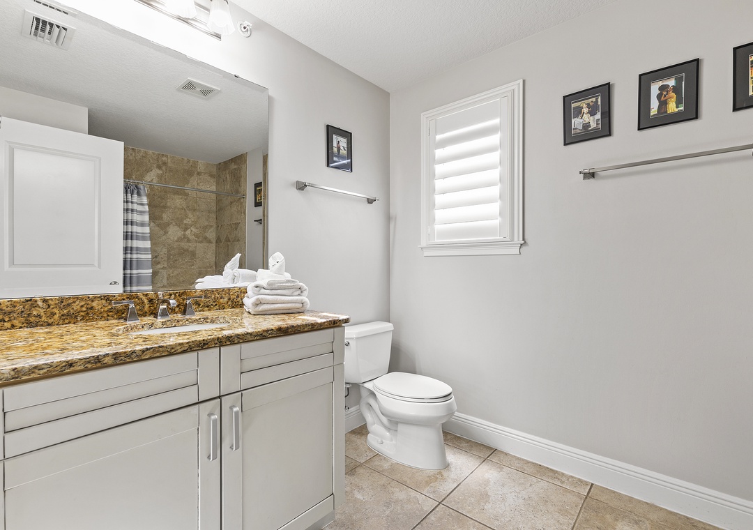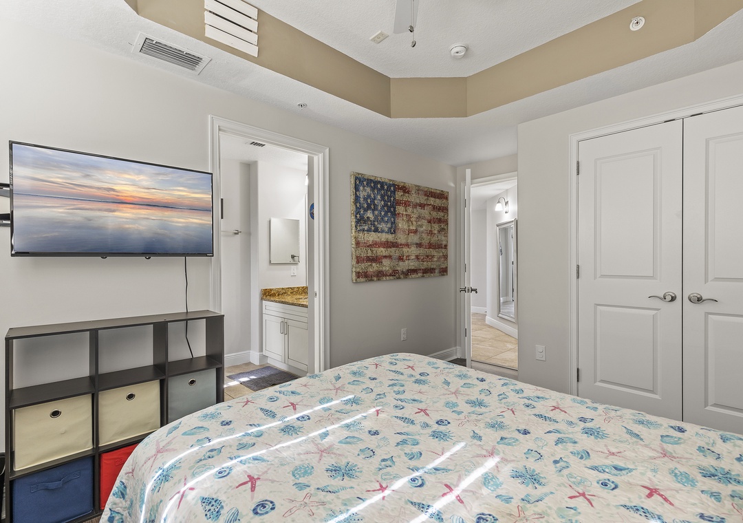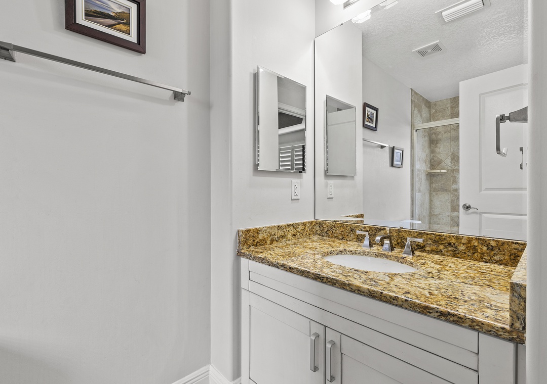 After a day filled with beachside relaxation, you'll find the master bedroom the perfect place to continue relaxing and catch up on some rest. You'll love ending each day snuggled in the king bed. The adjoining master bathroom provides a granite-top vanity, a standard bathtub, and plenty of bath towels. The second guest bedroom provides a cozy queen bed and a flat-screen TV. Similar to the master, a bathroom is attached ensuite and offers guests a walk-in shower, granite-top vanity, and plush towels. The third bedroom is furnished with a full bed and a TV. The nearby bathroom provides a walk-in shower with a white vanity and bath linens. While there is no cable in the bedrooms, they are all equipped with smart TVs enabled with Hulu and Netflix.