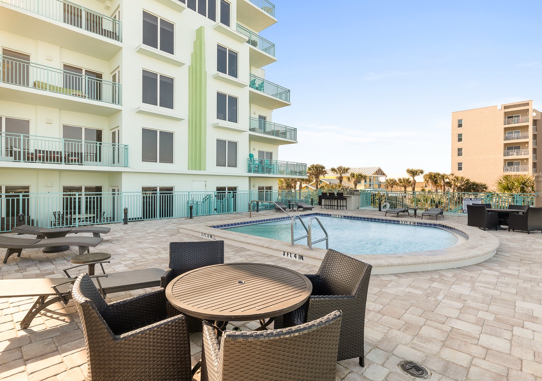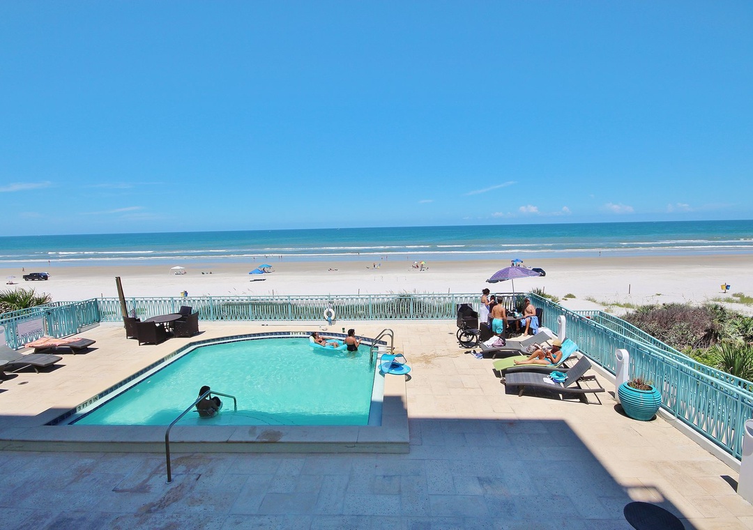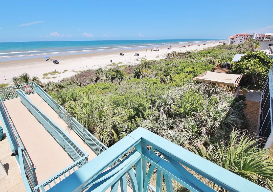 The elevated pool area provides views unmatched by any other complex on the driving section of New Smyrna Beach. With a large outdoor kitchen and barbecue area highlighted with resort-quality patio furniture and lounge chairs, you may just choose to spend all your vacation time relaxing by the pool. Enjoy the beauty of the natural unspoiled dune area on New Smyrna Beach, located right outside your door. A wooden walkway provides easy access to the white sandy beach, just steps away.