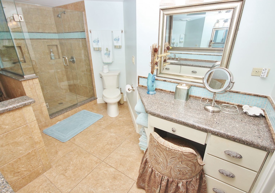 Tradewinds 503 features a private master bedroom with a king-sized bed, a dresser with a flat screen television, and plenty of space to make yourself feel right at home. The master bedroom is outfitted with beautiful furnishings. Enjoy the convenience of the in-suite bathroom providing all the necessities for your stay, including a vanity and a tub.