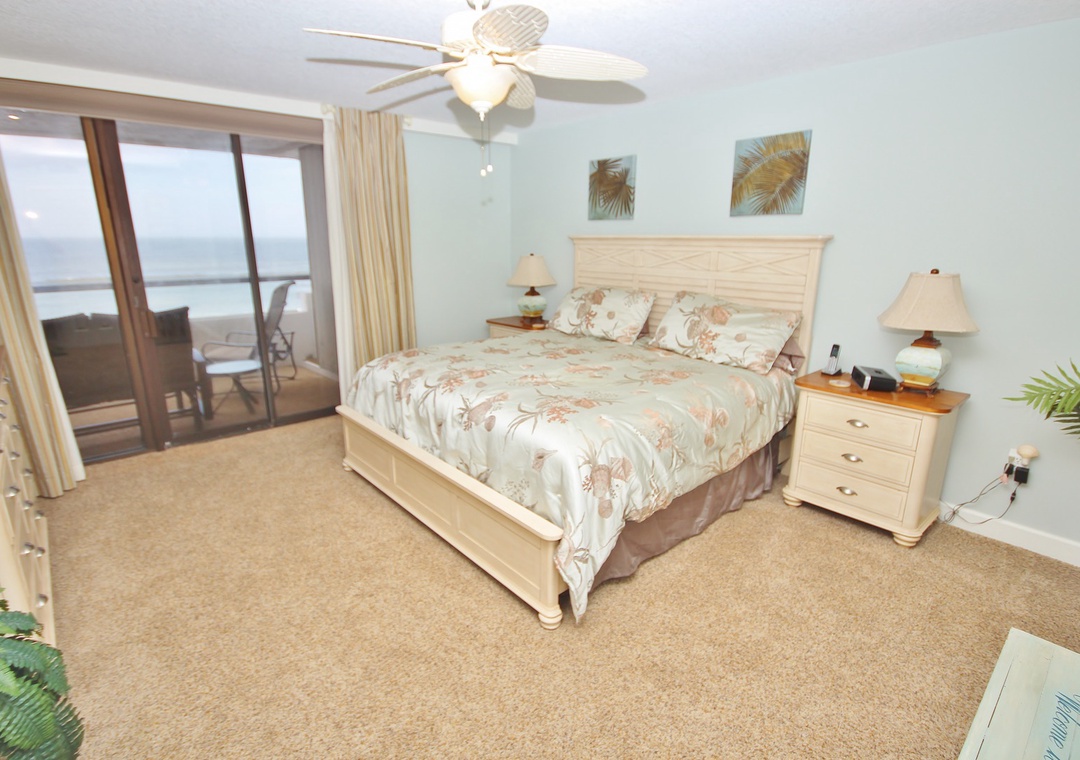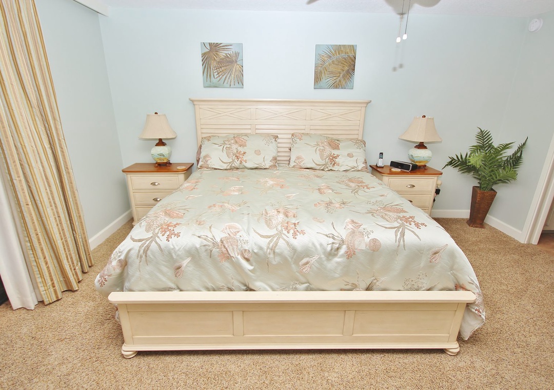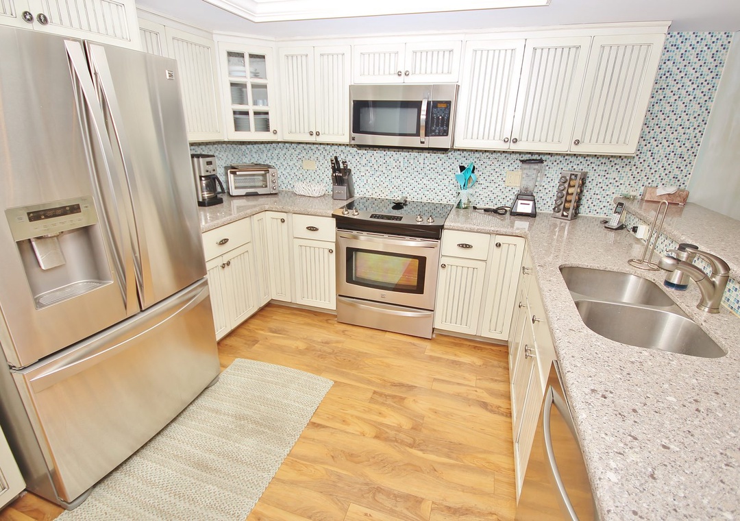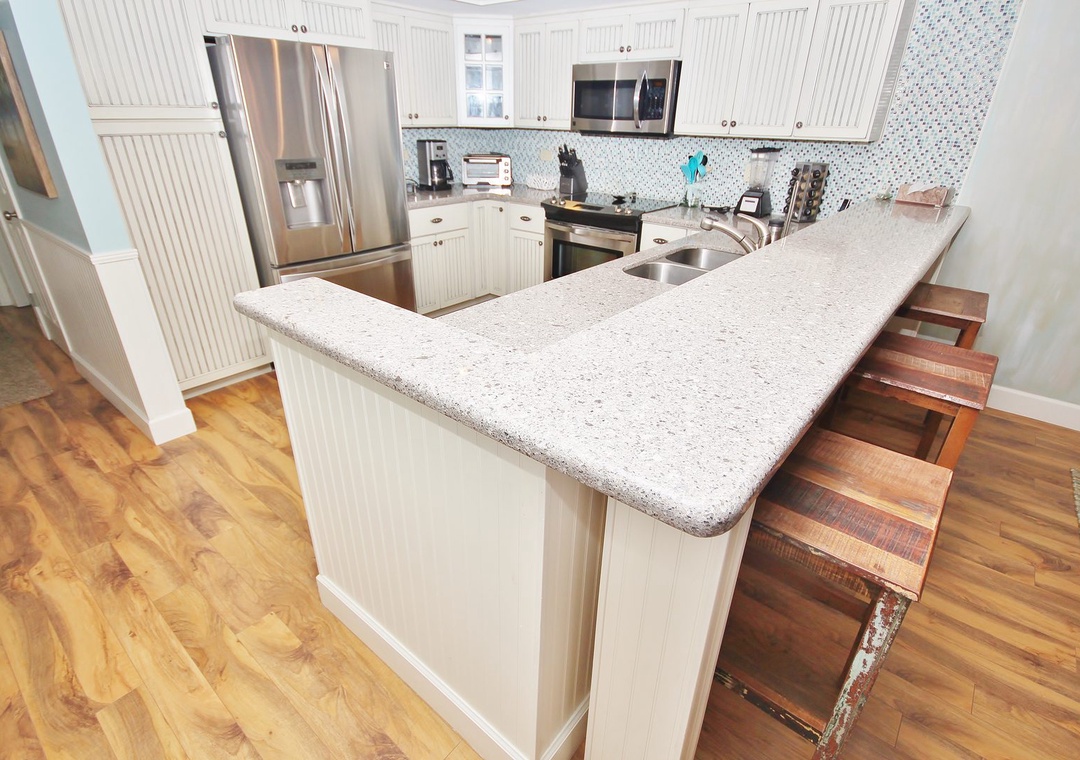The fully stocked kitchen features white cabinets and plenty of counter space. It is fully equipped with a dishwasher, microwave, refrigerator and freezer, stove top with oven, as well as, cooking and eating utensils to create some delicious meals during your stay. The dining area has a dining room table and seating for six. After dinner, take a step out on the balcony and enjoy the peaceful sounds and view of the ocean. There is also a separate ice maker and mini fridge in the property. It's a really convenient way to pack a cooler for a day out on the beach!