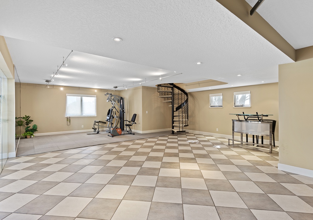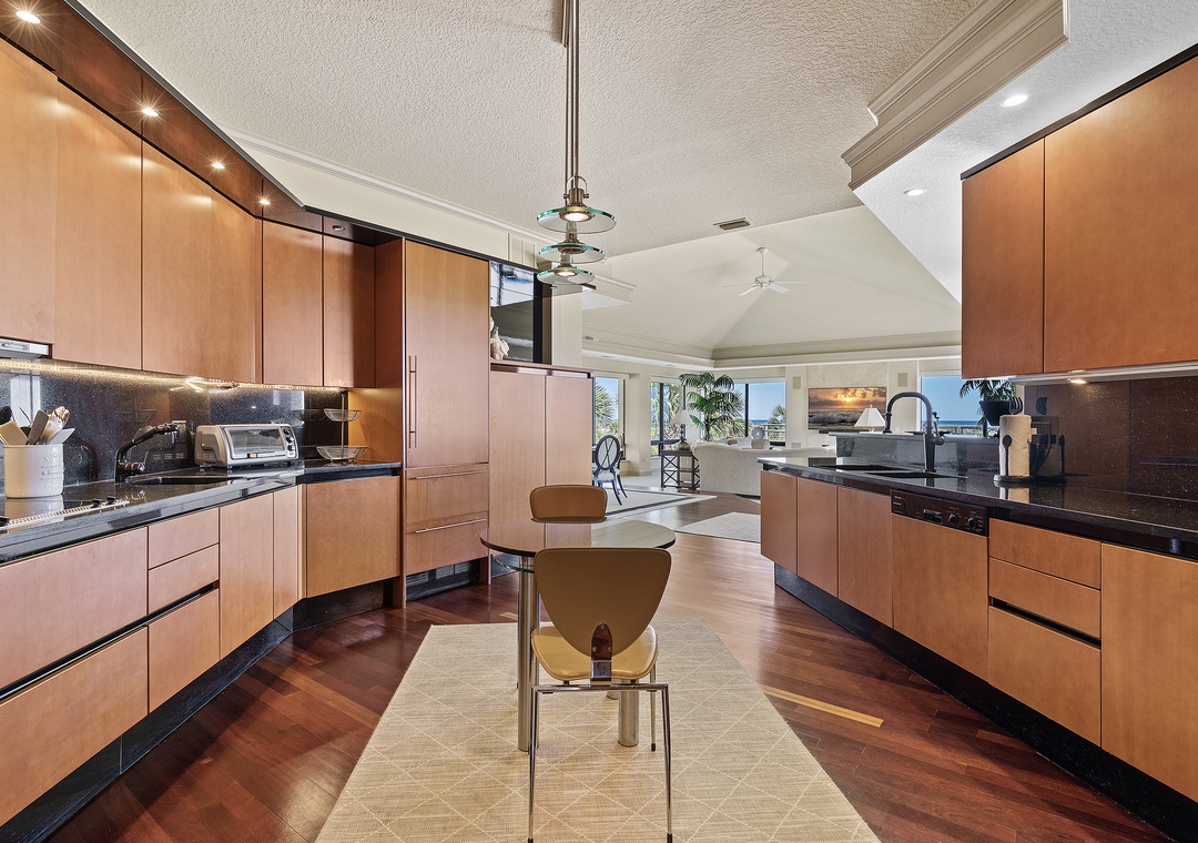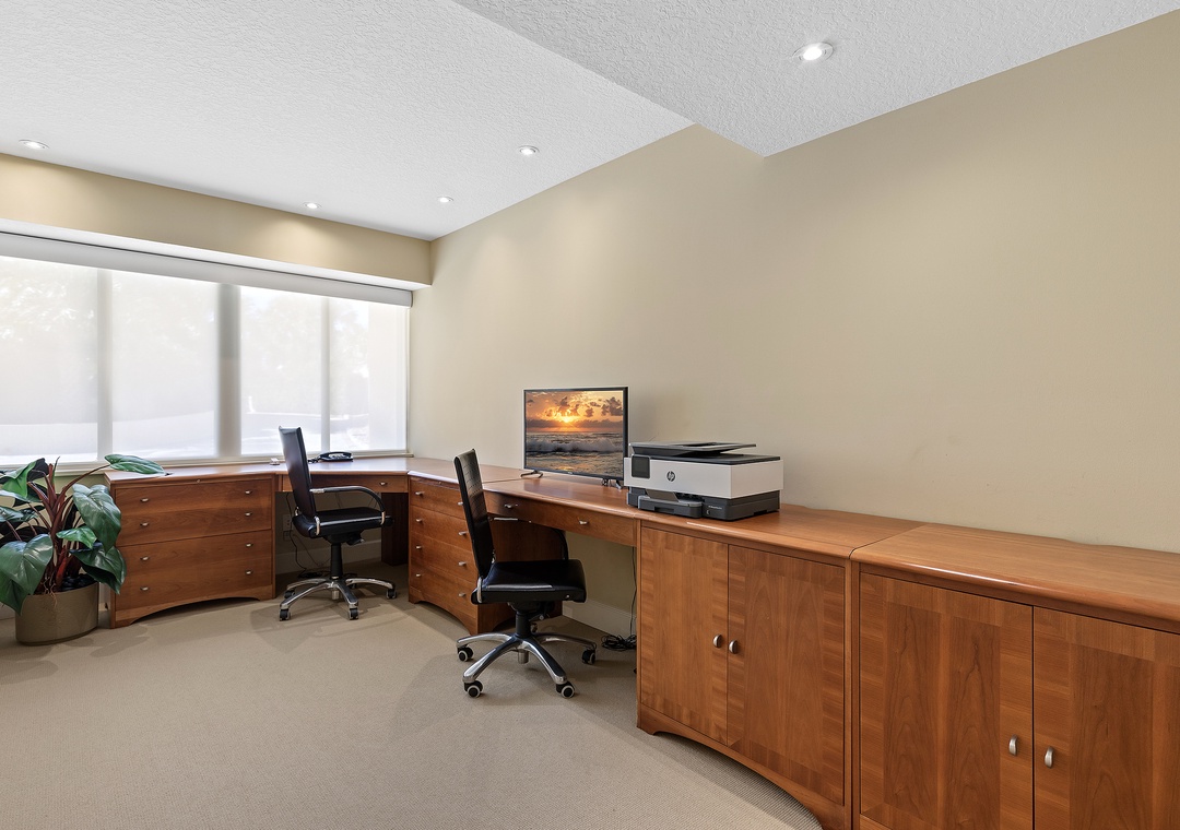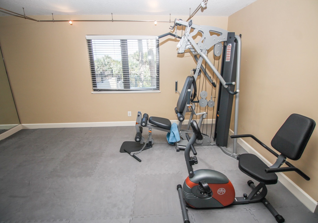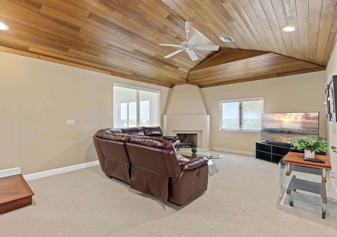 Immediately upon entering, to the right through the glass door you will find your own mini gym with a multi-use machine and recumbent bike complete with rubber floor and a wall of mirrors. The spiral staircase will lead you to the Upper Level where the ocean facing den with cathedral wood ceiling, leather reclining sectional sofa, and huge Smart TV awaits-this connects to the secondary master's ensuite bathroom featuring jetted bathtub, vanity and separate shower and toilet room. The extra-large bedroom features 2 queen beds, Smart TV, with walk-in closet. A wet bar connects and completes this upper-level secondary primary bedroom suite.