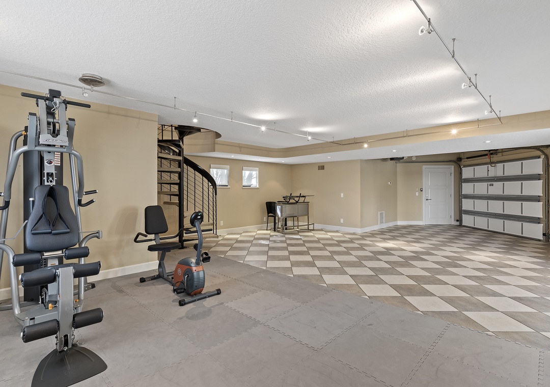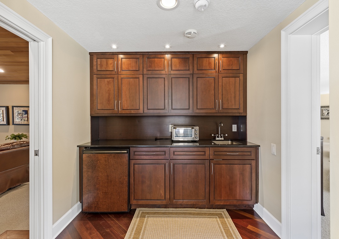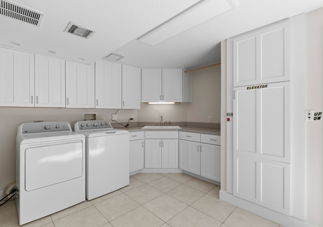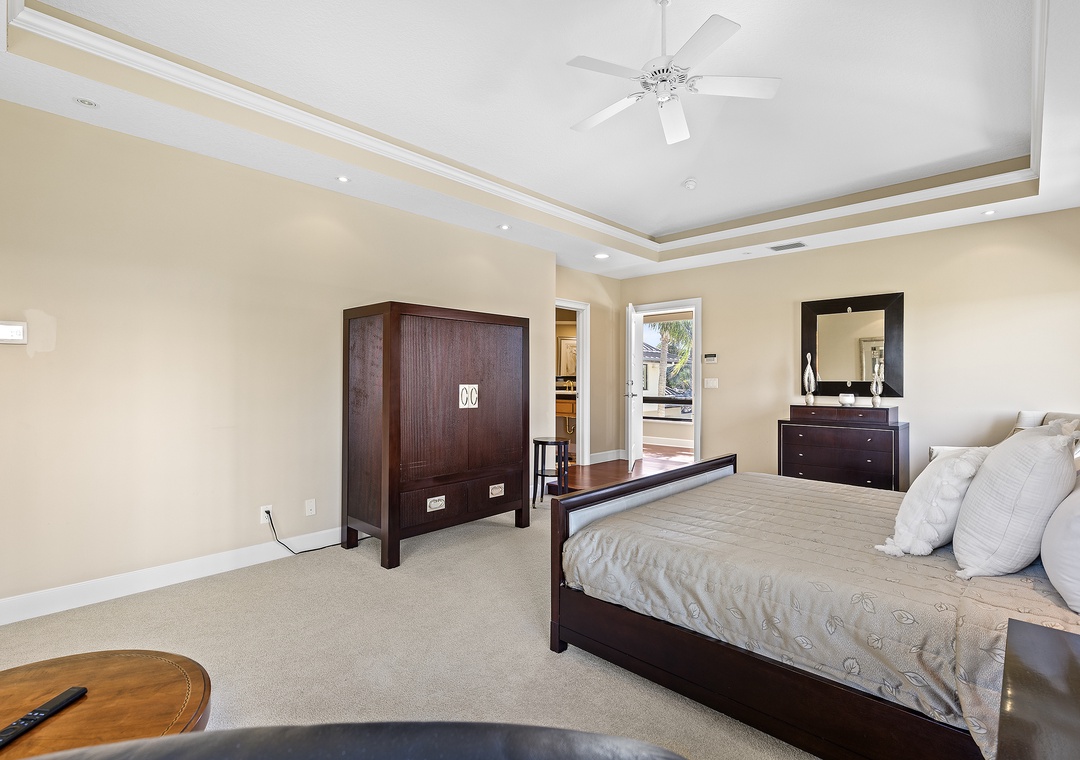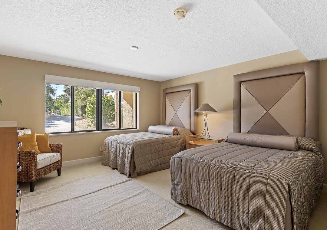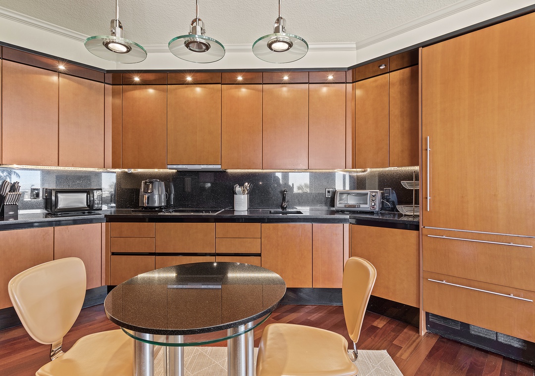 Immediately upon entering, to the right through the glass door you will find your own mini gym with a multi-use machine and recumbent bike complete with rubber floor and a wall of mirrors. The spiral staircase will lead you to the Upper Level where the ocean facing den with cathedral wood ceiling, leather reclining sectional sofa, and huge Smart TV awaits-this connects to the secondary master's ensuite bathroom featuring jetted bathtub, vanity and separate shower and toilet room. The extra-large bedroom features 2 queen beds, Smart TV, with walk-in closet. A wet bar connects and completes this upper-level secondary primary bedroom suite.