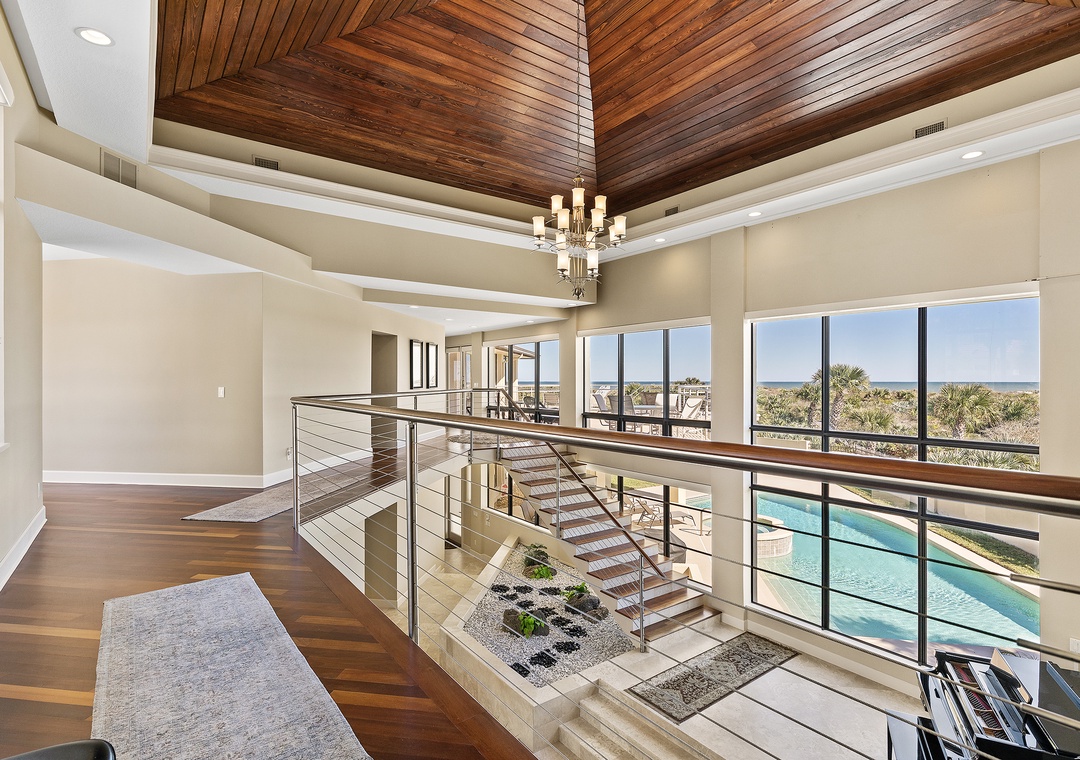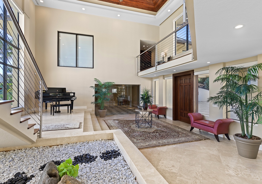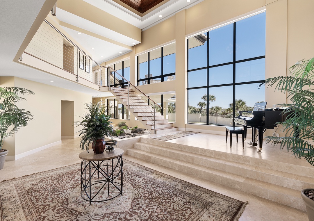 Grand Entrance: As you walk through the front door, you’ll be greeted by the grandeur of the foyer, complete with a baby grand piano, impressive, vaulted wood ceiling, soaring floor-to-ceiling windows, and a stunning staircase that sets the tone for the rest of the home.