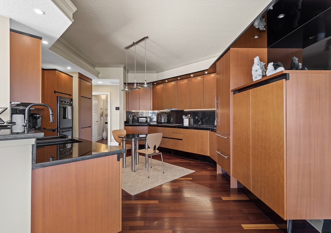 The spacious kitchen featuring double ovens, half bath, living room and dining room are all on the upper level. The living and dining room and the kitchen all open onto the upper deck and have million-dollar views.