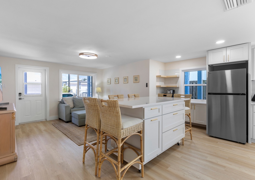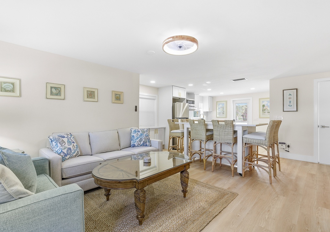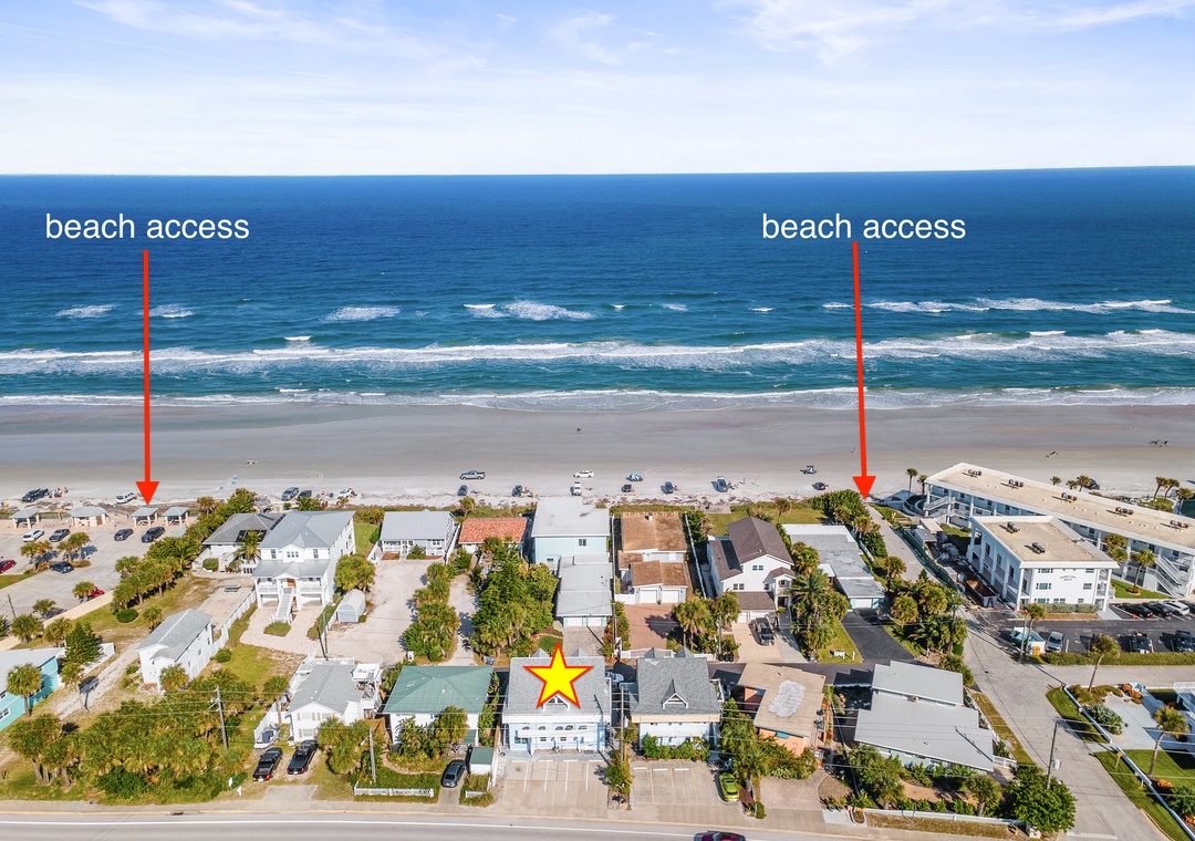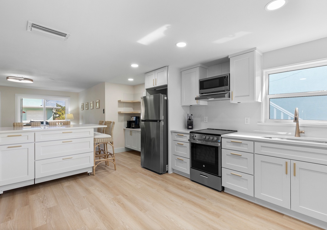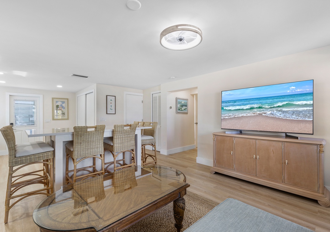 Step into your dream beach getaway! This fully renovated first-floor coastal charmer has everything you need for the perfect stay—all on one easy level. With three comfy bedrooms and two sparkling bathrooms (both with walk-in showers), there’s room for everyone to relax and unwind. You’ll love the roomy king bedroom, cozy queen bedroom, and a fun daybed with trundle and ensuite bath—plus extra sleeping space with a twin sleeper sofa and a queen sleeper sofa in the living area. Whip up meals in the modern full kitchen, toss in a load of laundry with your in-unit washer and dryer, and then head out to the shared ocean-view patio to soak up the breeze. Gather around the firepit under the stars or fire up the gas grill for a family cookout after rinsing off in the outdoor shower. Pet-friendly with no weight limit, this bright and breezy beach retreat is all about comfort, convenience, and coastal fun—just steps from the sand!