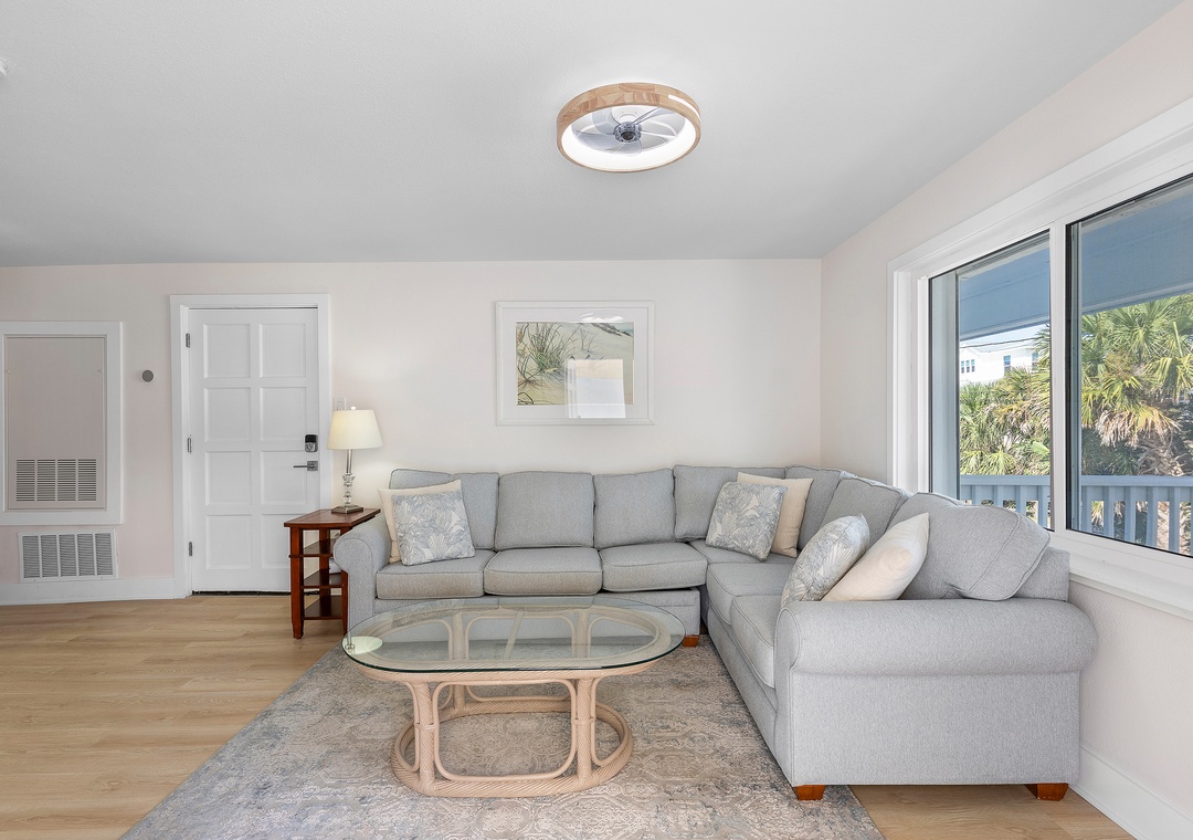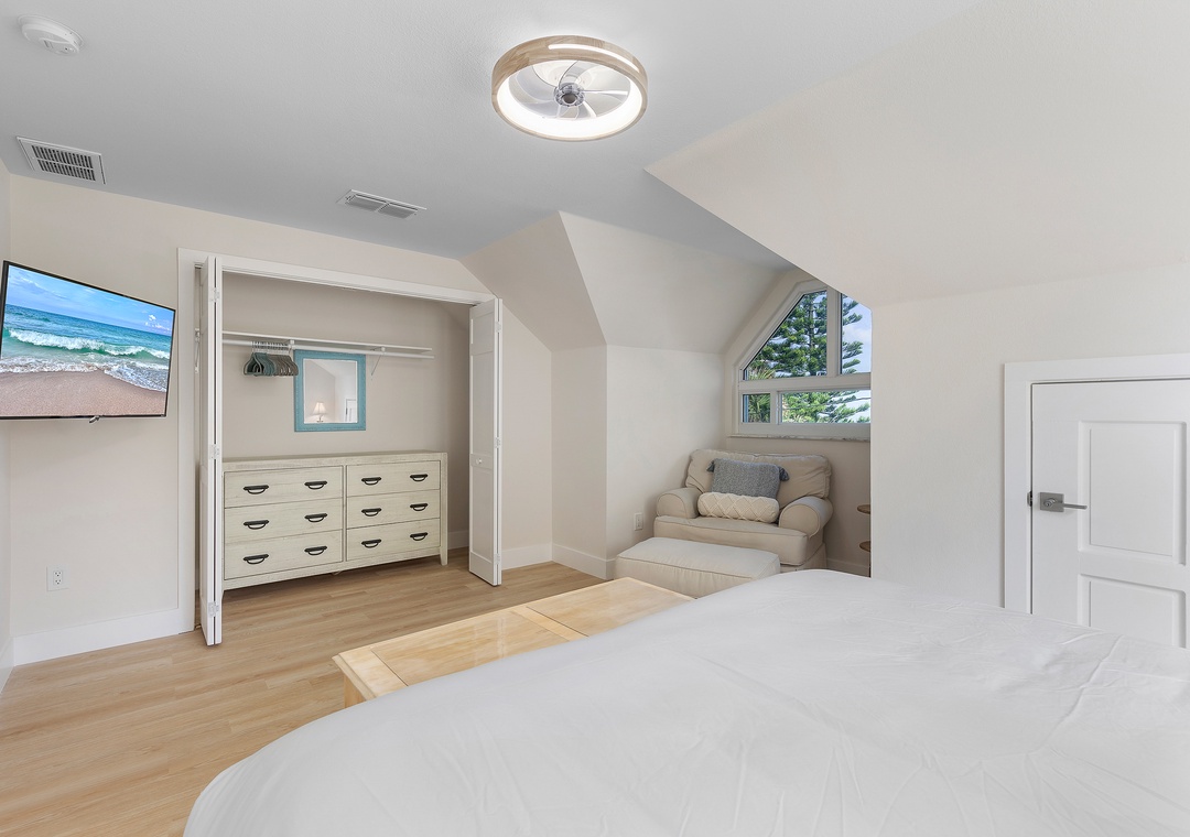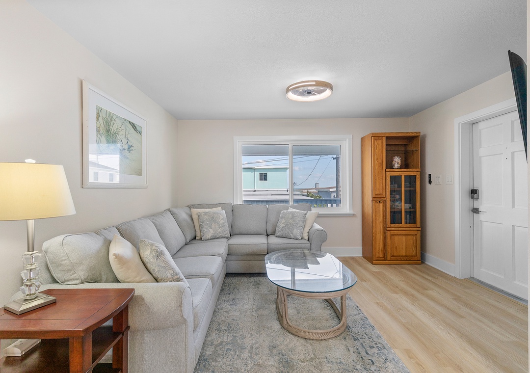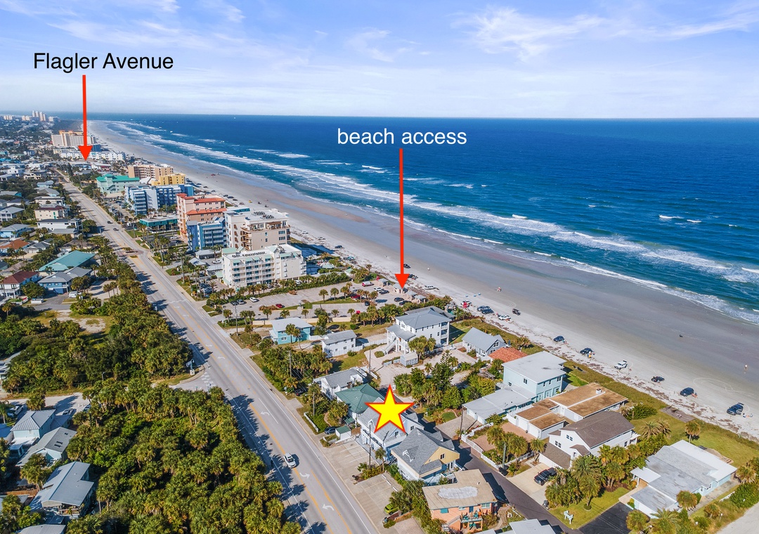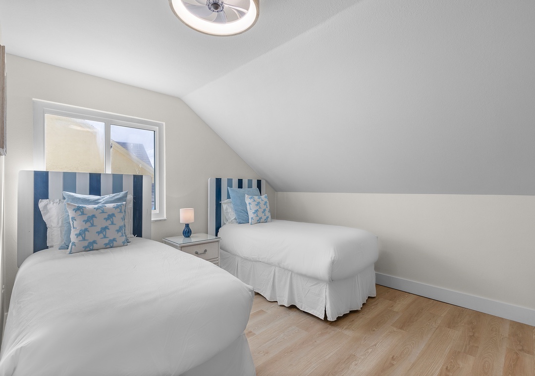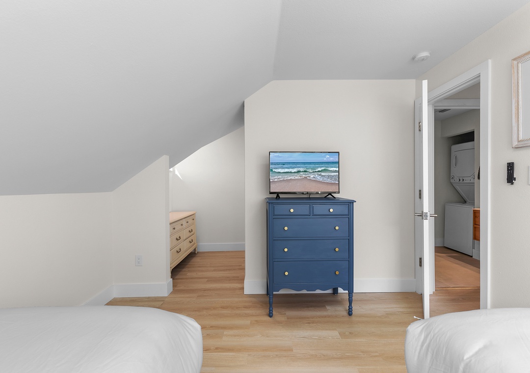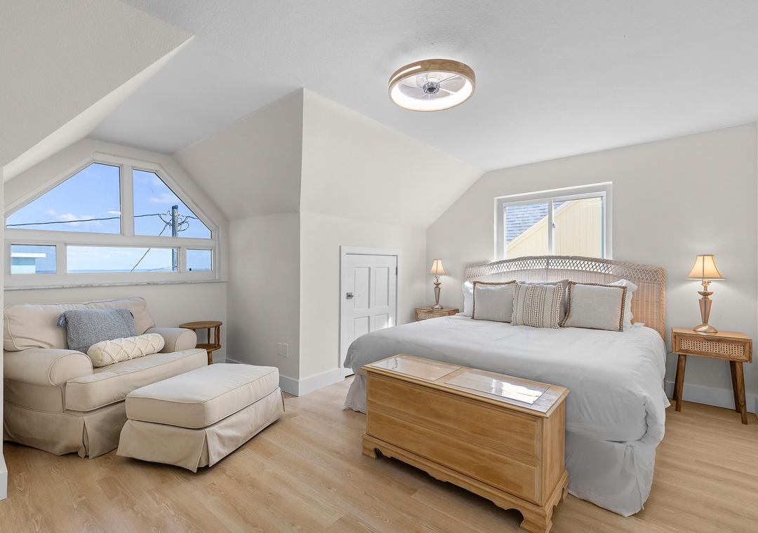 Your ocean view getaway begins the moment you step into this beautifully renovated two-story coastal retreat! Perched above street level, this private unit occupies the 2nd and 3rd floors of the home, offering both privacy and stunning views. Enter from your own private exterior staircase or through the interior hall entrance, then relax on your private 2nd-floor balcony with outdoor seating—perfect for morning coffee or evening cocktails in the sea breeze. Inside, you’ll find a bright, open living area with a comfy sleeper sofa, a full eat-in kitchen, and a sparkling bathroom with a walk-in shower. Upstairs, the 3rd floor features a serene king bedroom with breathtaking ocean views, a cheerful bedroom with two twin beds, and a second full bathroom with a shower/tub combo. For your convenience, there’s also an in-unit washer and dryer on this level. Guests enjoy shared access to the ground-level patio, outdoor shower, firepit, and grill—ideal for unwinding after a day at the beach. With space for up to six guests, this modern, light-filled retreat combines coastal charm, comfort, and effortless beachside living.