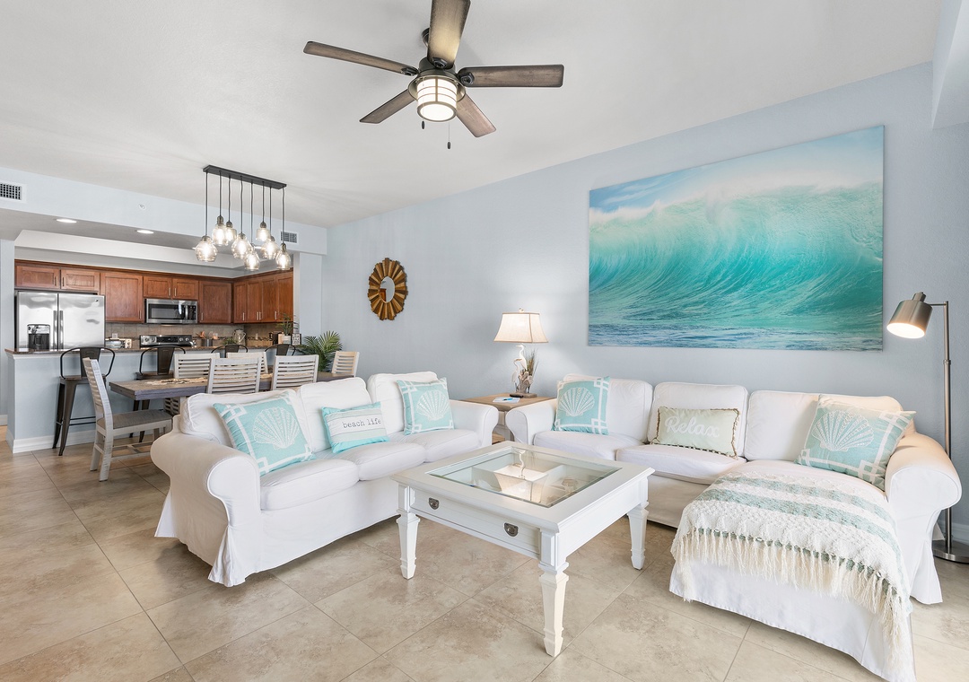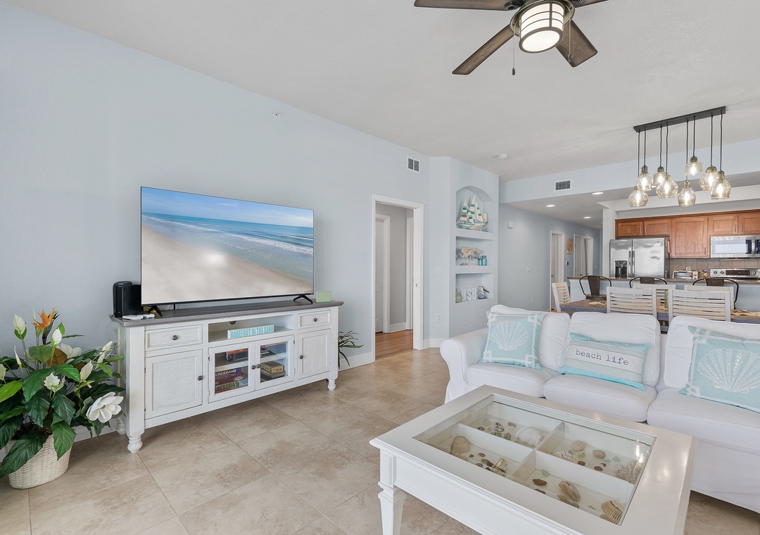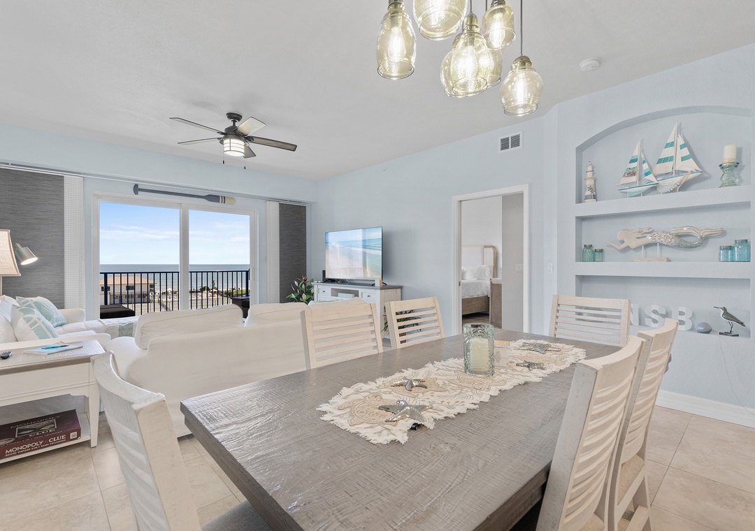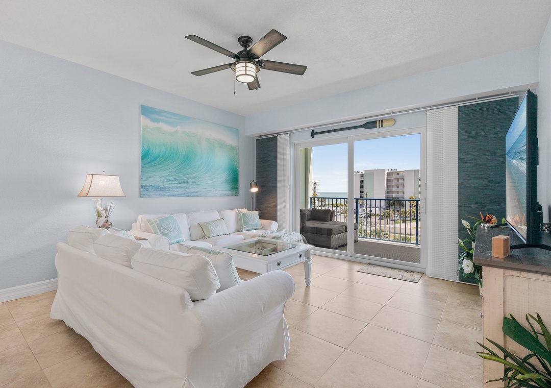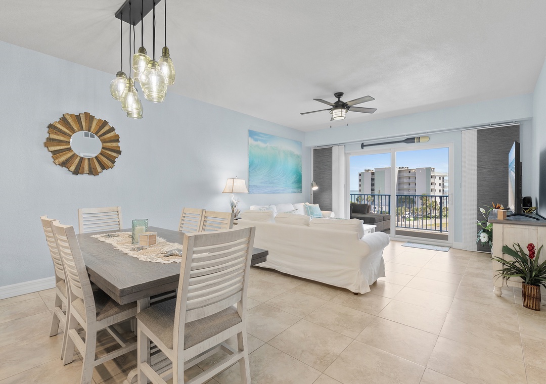 Step inside to discover a bright and airy open floor plan with plenty of natural light, thoughtfully furnished for comfort and style. The living room flows effortlessly into the dining area and fully equipped kitchen, featuring full-size appliances, cookware, utensils, and all the essentials for home-cooked meals or entertaining. The space opens up to a private balcony, perfect for morning coffee or evening wine while enjoying the ocean breeze and partial beach views.